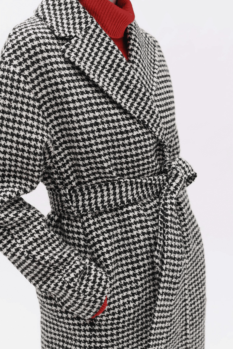 Conçu pour sublimer votre silhouette, ce manteau mi-long à la coupe droite se distingue par son col revers classique et sa ceinture amovible ton sur ton qui marque la taille avec finesse. Les manches longues et les poches discrètes intégrées dans la couture assurent confort et praticité au quotidien. Son motif pied-de-poule, emblématique et intemporel, dynamise vos looks hivernaux sans effort.