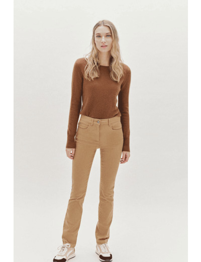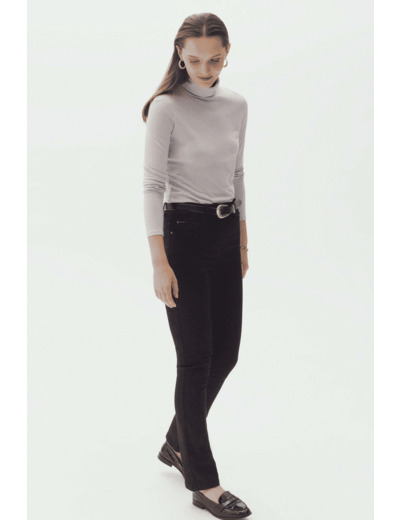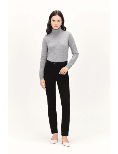 Réponse : Oui, sa coupe droite et sa matière stretch s’adaptent parfaitement à toutes les silhouettes.