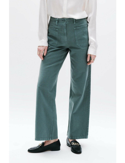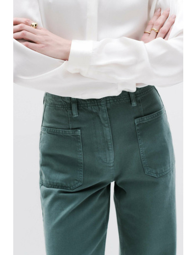 Confectionné en coton 100%, ce pantalon allonge la jambe grâce à sa coupe légèrement évasée et sa longueur parfaite de 106 cm (taille 38). Polyvalent, il s’adapte aussi bien à un look casual avec un pull en cachemire et des mocassins qu’à une tenue plus sophistiquée associée à une blouse fluide et des sandales à talons. Son design épuré et sa ceinture intégrée avec passants assurent un maintien optimal tout en soulignant la taille.