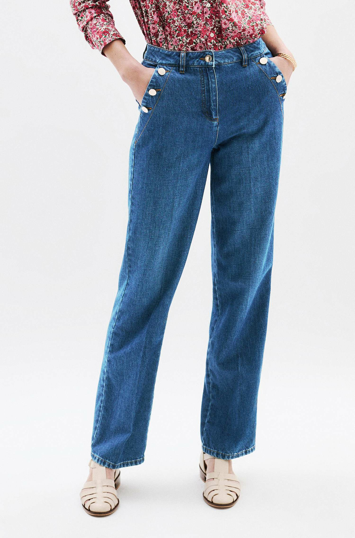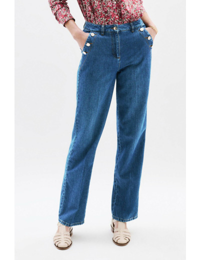 Confectionné en coton 100%, ce jean se distingue par sa polyvalence : il s’adapte aussi bien à un look casual chic qu’à une tenue plus sophistiquée. Associez-le à une chemise à motif floral et des sandales plates pour une allure fraîche et naturelle, ou optez pour un pull léger en maille et des escarpins pour un rendu élégant au quotidien. Sa longueur de 109,5 cm pour une taille 38 garantit une tenue parfaitement ajustée.