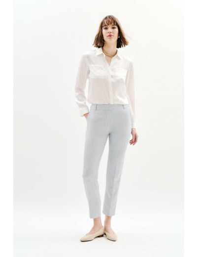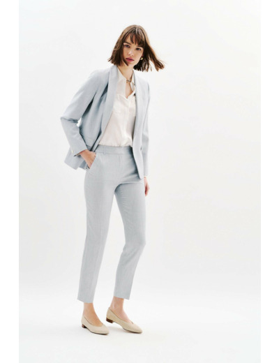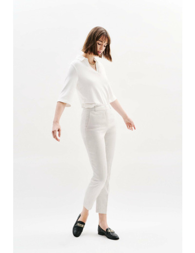 Confectionné dans un tissu mêlant viscose et polyester recyclé, ce pantalon allie confort et durabilité. Sa coupe ajustée et sa longueur étudiée offrent une allure raffinée, facile à associer avec une chemise en soie ou un pull col roulé. Portez-le avec les vestes Vjana2 ou Virevolte pour un ensemble harmonieux et sophistiqué.