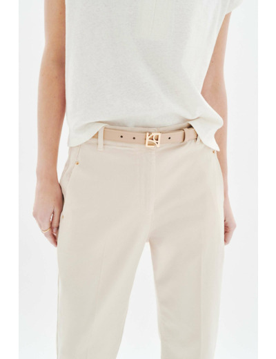 Pantalon coupe cigarette, longueur totale 93 cm pour une taille 38. Tissu principal : 61% coton, 37% lyocell, 2% élasthanne. Entretien recommandé : nettoyage à sec professionnel ou lavage délicat à 30°C sur l’envers. Repassage à basse température (maximum 110°), sans vapeur. Séchage en machine interdit.