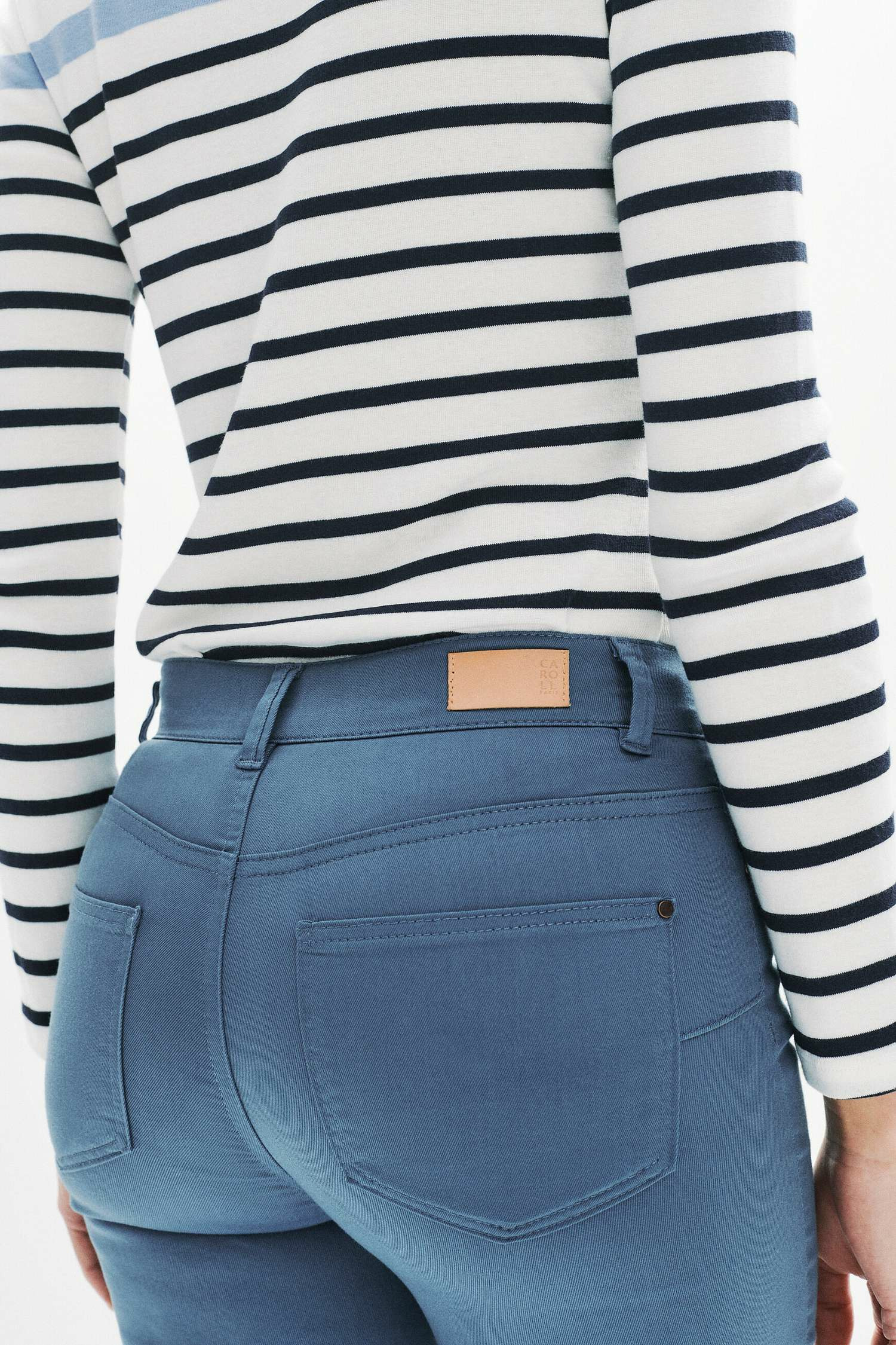 Tissu principal : 67% coton, 29% polyester, 4% élasthanne. Coupe slim, modèle 5 poches, longueur 107 cm (taille 38). Lavage recommandé à 30°C en cycle délicat, repassage à basse température (max 110°), nettoyage à sec conseillé. Sèche-linge interdit.