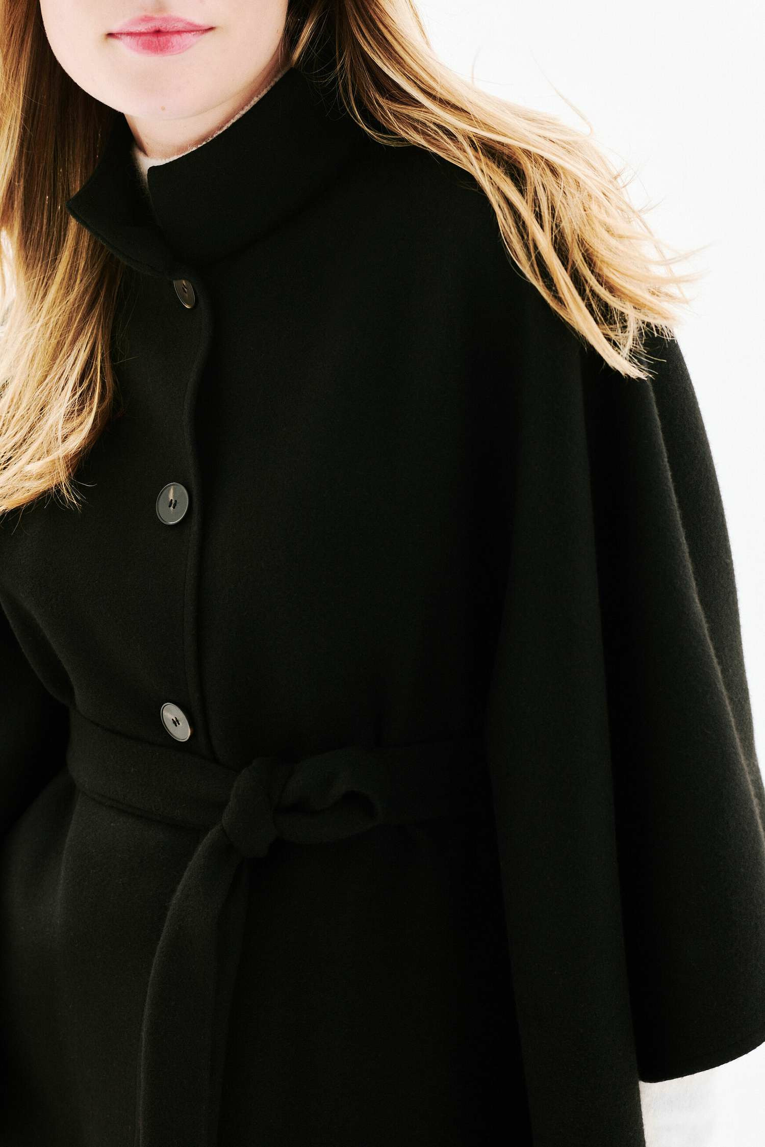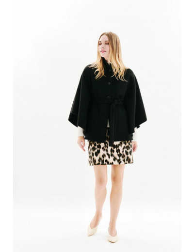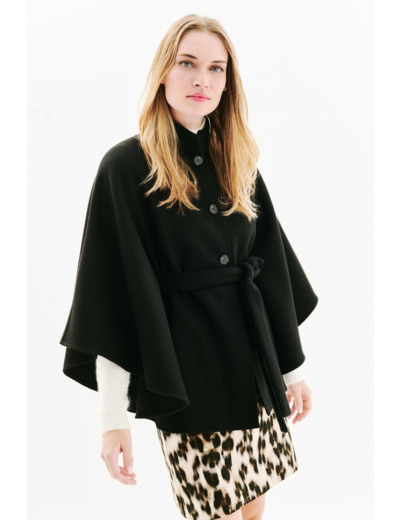 Poncho uni, col montant, longueur 65 cm, fermeture par boutonnière, ceinture ton sur ton à nouer. Composition : 65 % polyester, 35 % viscose. Lavage à la main recommandé pour préserver la qualité du tissu.