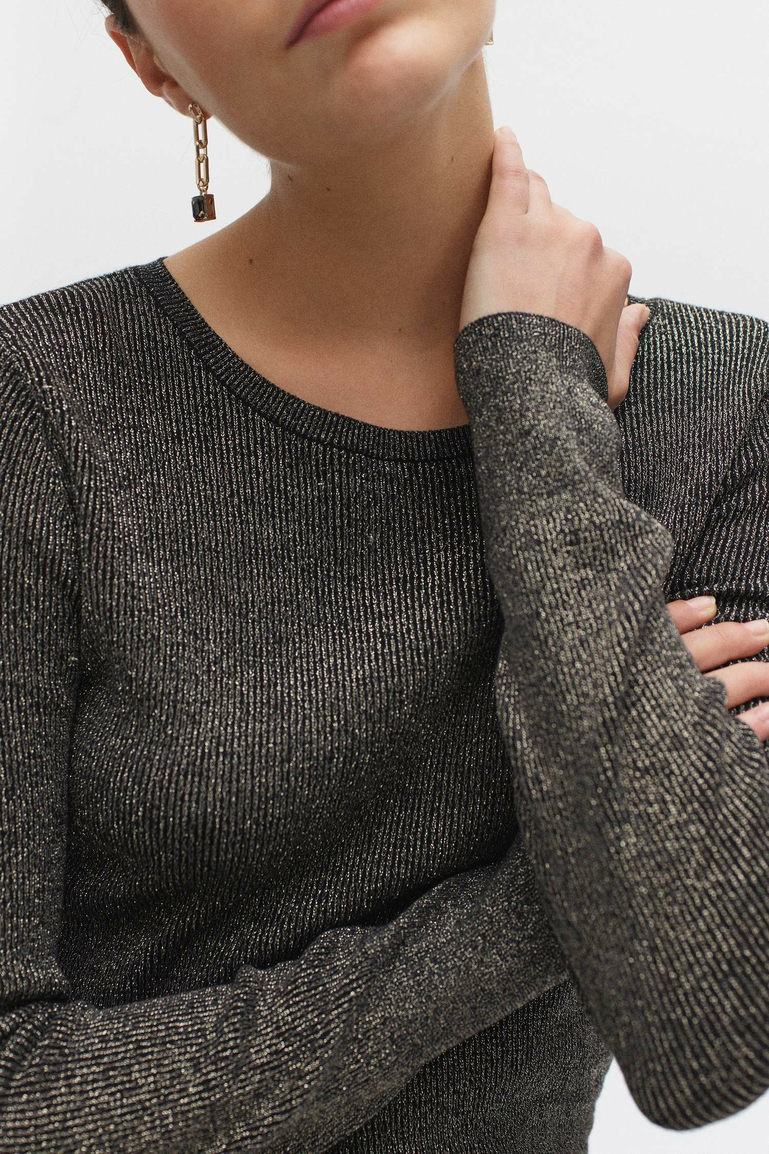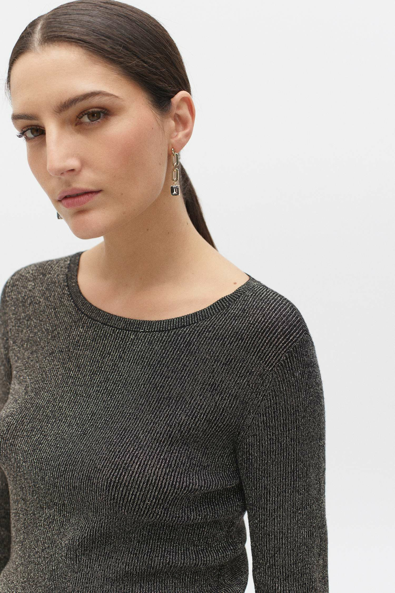 Tissu principal : 65% viscose, 19% polyester, 14% polyamide, 2% élasthanne. Coupe droite, col rond, emmanchures basses, manches longues. Finitions bord-côtes. Longueur 56 cm en taille S. Lavage à la main recommandé pour préserver la qualité des fibres et l’éclat du Lurex.