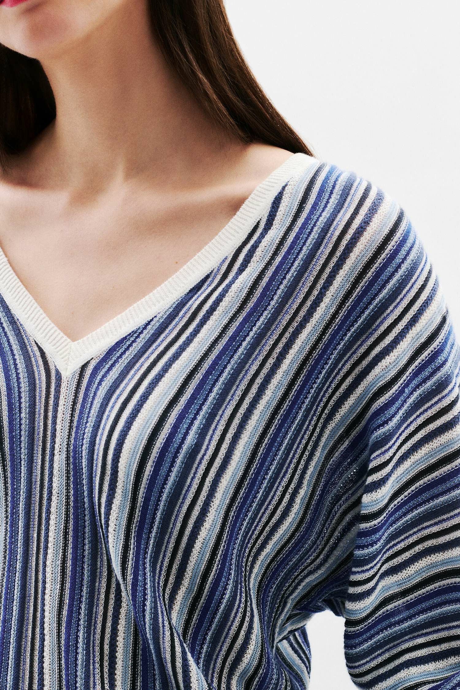 Pull droit, col V, manches 3/4, longueur 58 cm en taille S. Tissu principal composé à 50 % de lin et 50 % de coton. Lavage à la main uniquement, repassage à basse température (maximum 110°) sans vapeur, interdit au sèche-linge.