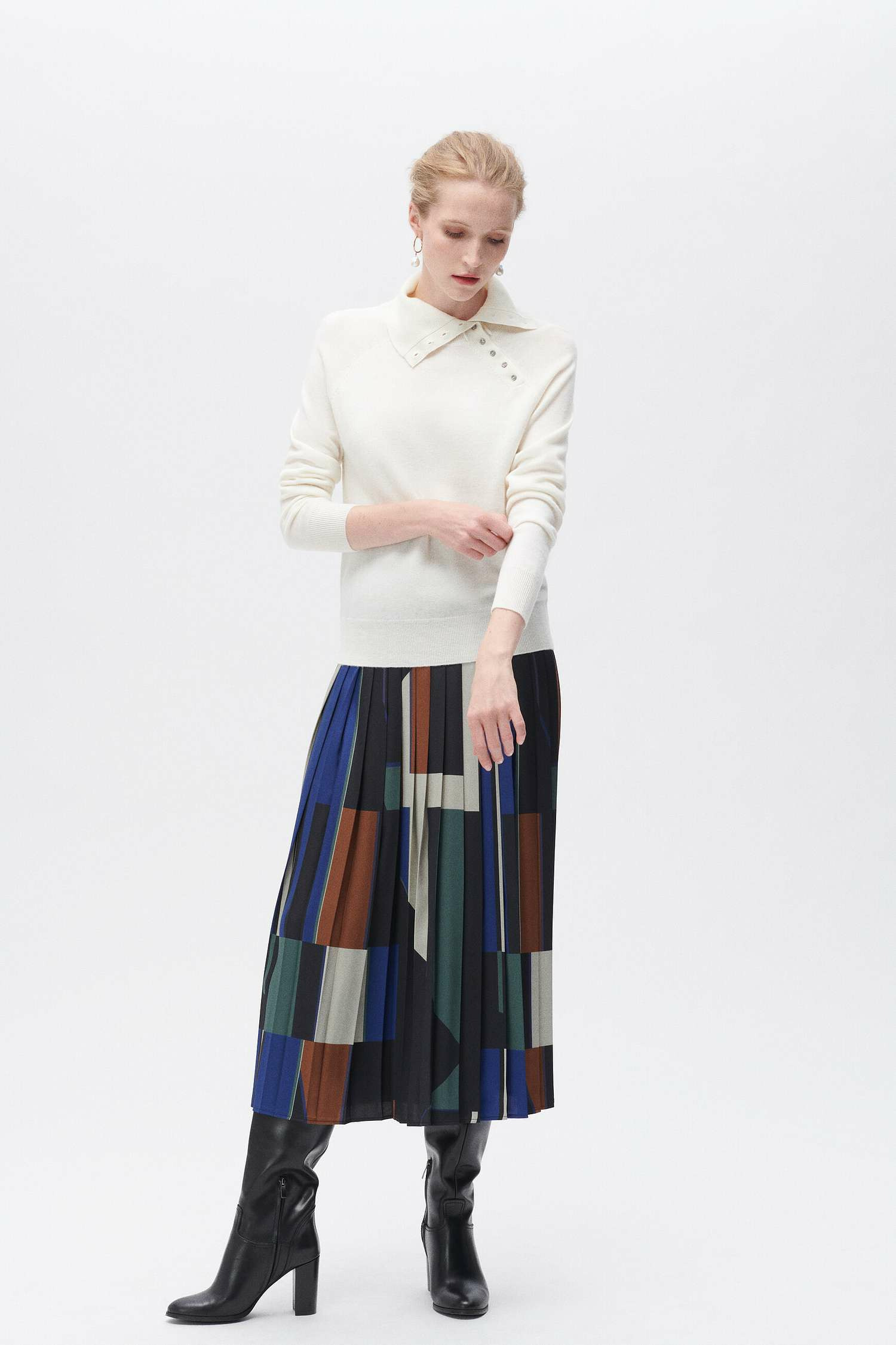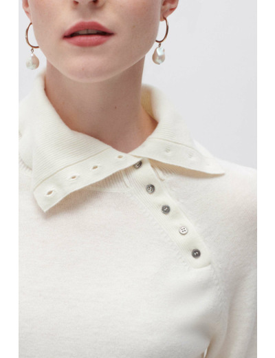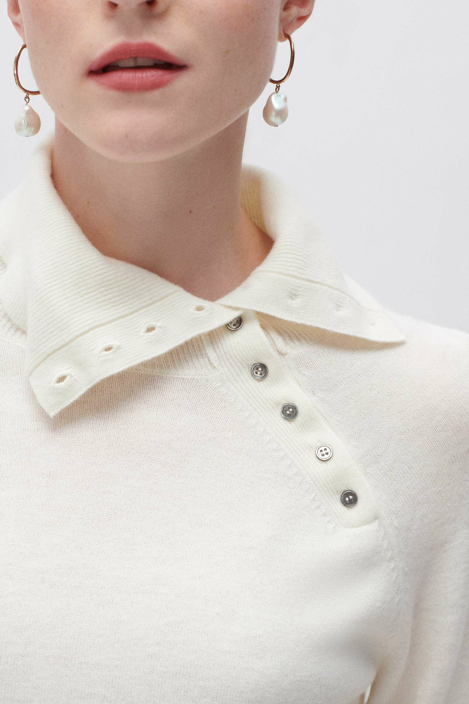 Pull à la coupe droite, col à revers fermé par une boutonnière sur le côté, manches longues, finitions bord-côte, surpiqûres aux emmanchures. Longueur 61 cm en taille S. Tissu principal : laine RWS 100%. Lavage à la main recommandé.