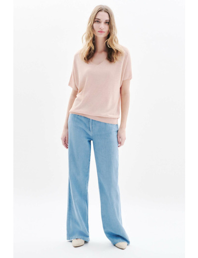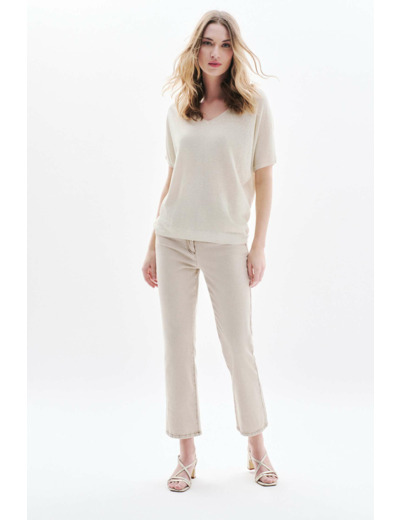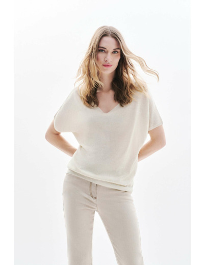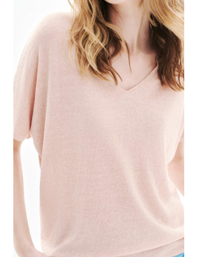 Confectionné dans un mélange de lin et viscose, ce pull assure une sensation de légèreté idéale pour varier les températures. Les paillettes discrètes apportent une touche de brillance subtile qui illumine vos tenues, tandis que les manches courtes renforcent son côté estival et facile à porter. Sa longueur de 60 cm pour une taille S en fait une pièce versatile, parfaite pour composer des looks élégants ou casual.