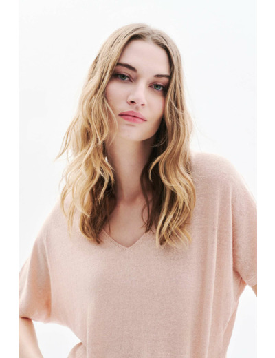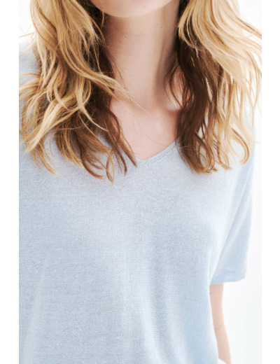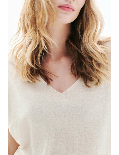 Tissu principal : 48% lin, 40% viscose, 7% polyamide, 5% fil métallisé. Coupe large, col V, manches courtes, longueur 60 cm (taille S). Lavage à la main uniquement, repassage conseillé à basse température (max 110°) sans vapeur. Séchage en machine interdit.