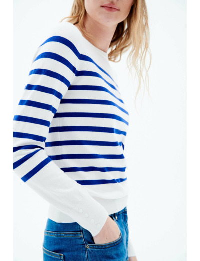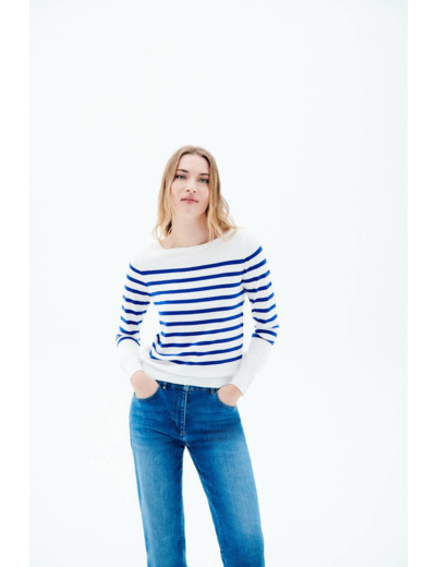 Adoptez l’élégance intemporelle du pull Mjulie, où la marinière classique se réinvente avec modernité. Sa coupe droite et ses rayures bleues sur fond blanc apportent une touche fraîche et raffinée à votre garde-robe.