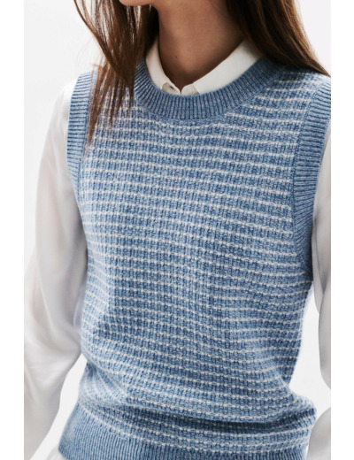 Réponse. Le pull Mleo a une coupe droite, courte et sans manches avec un col rond.
