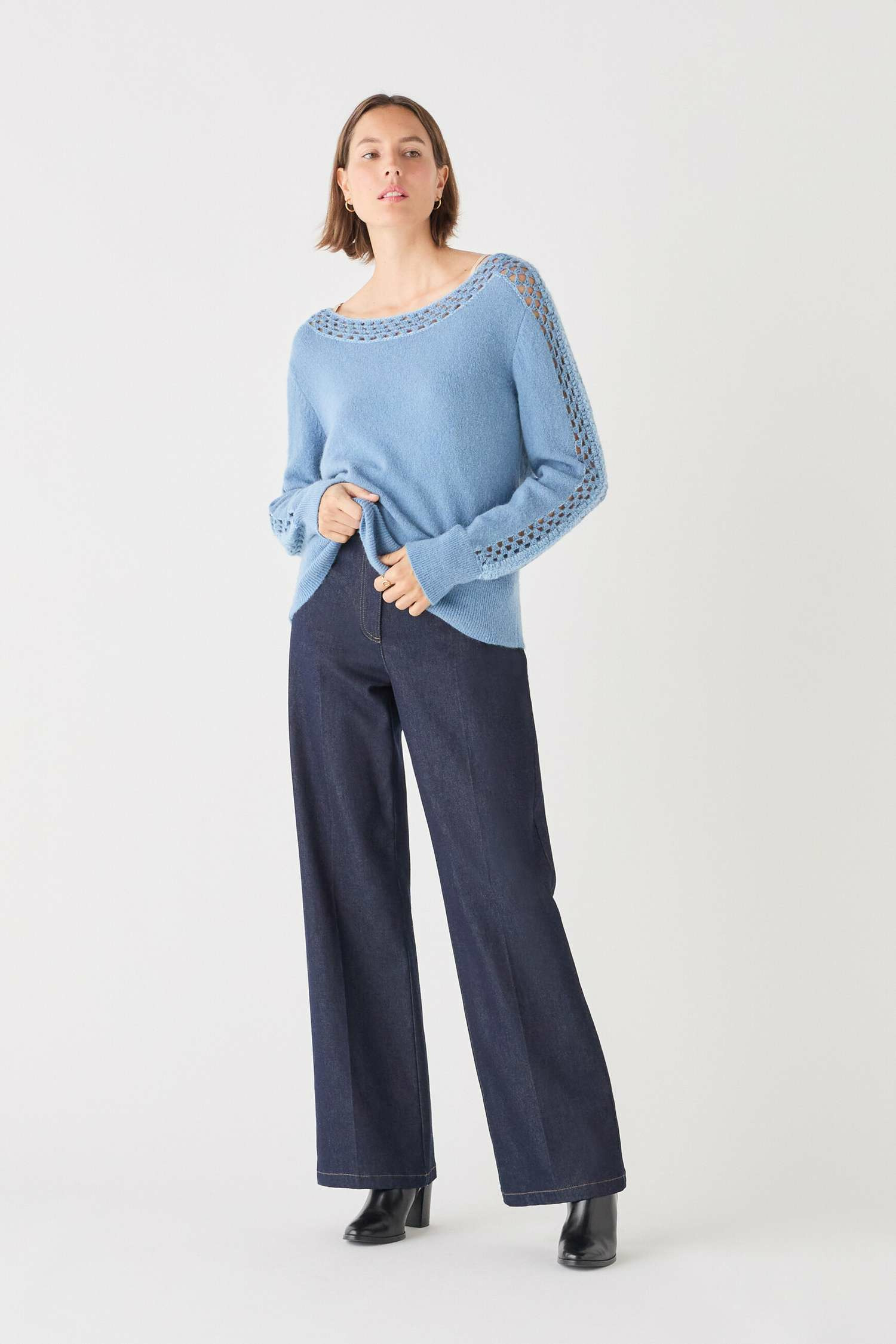 Confortable et polyvalent, ce pull allonge visuellement la silhouette grâce à sa coupe droite et son col bateau qui libère le décolleté avec élégance. Sa matière douce et légèrement moelleuse enveloppe la peau sans jamais irriter, pour un porté agréable toute la journée.