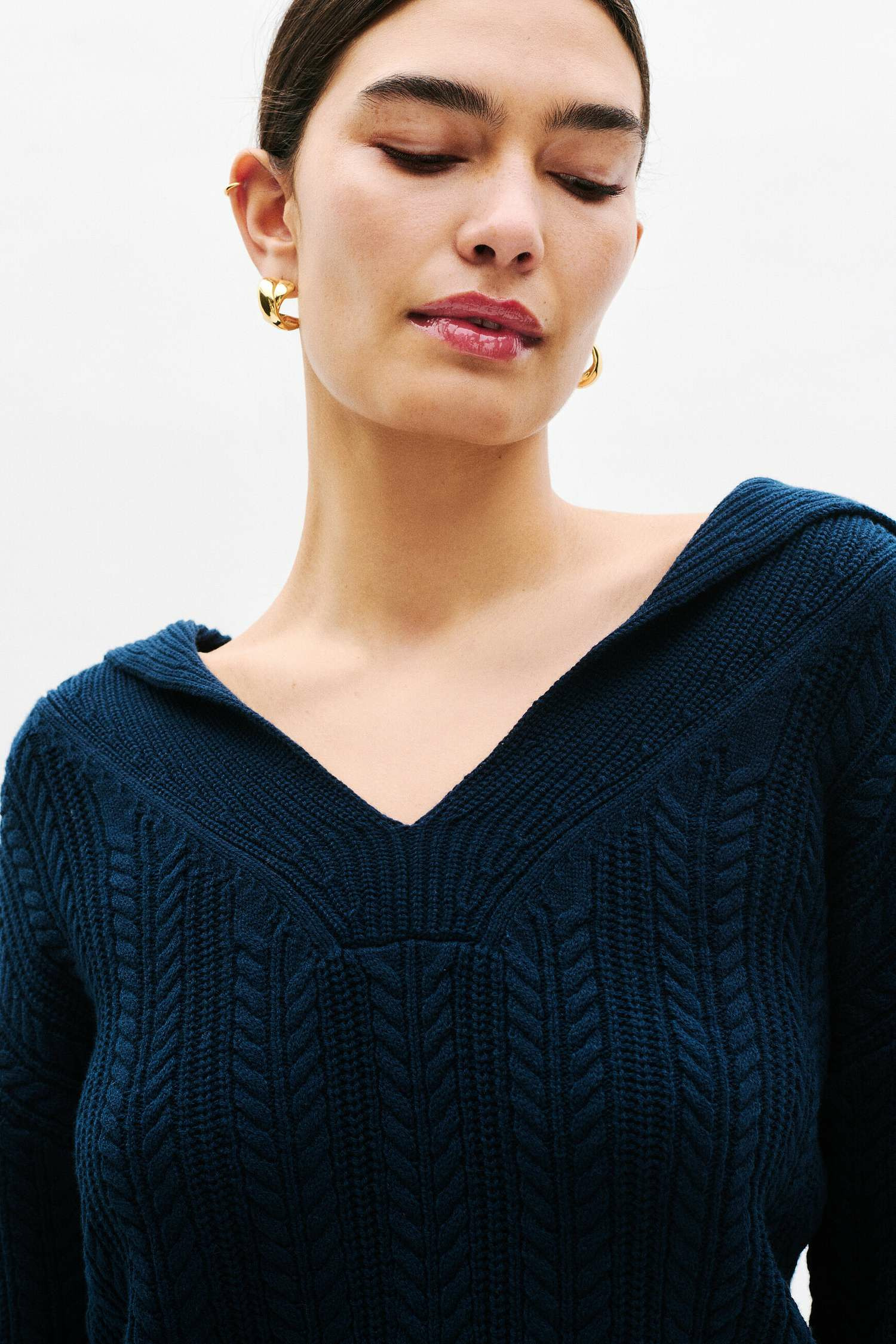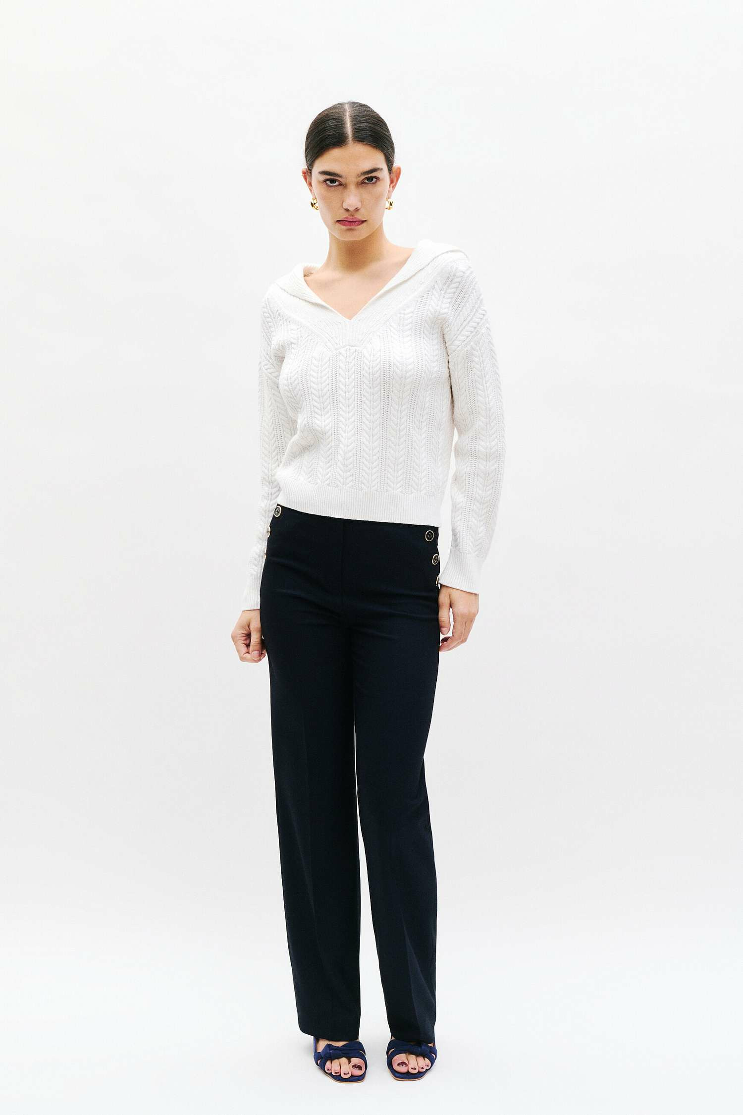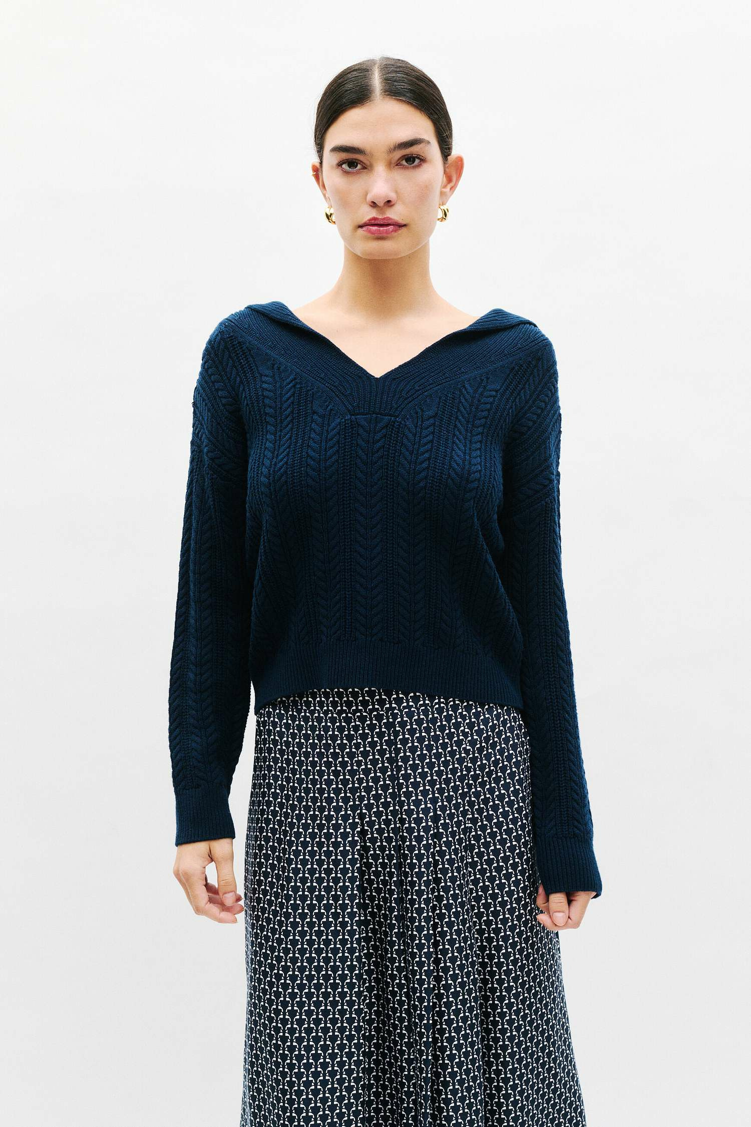 Conçu pour épouser les lignes du corps avec un col V délicat et des manches longues, ce pull s’impose comme un essentiel de votre garde-robe hivernale. Son design minimaliste se prête aussi bien à une jupe mi-longue imprimée et des bottines en cuir qu’à un pantalon ajusté associé à des escarpins, parfait pour une allure working girl affirmée.