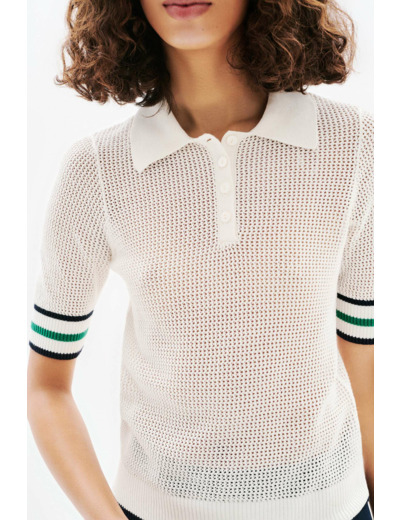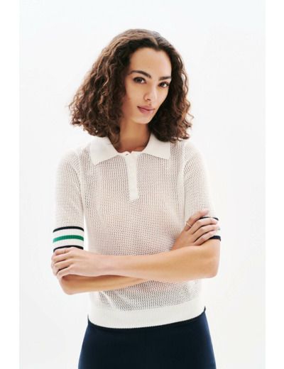 Conçu en coton 100 %, ce pull à la coupe droite légèrement cintrée offre une silhouette moderne et confortable. Ses manches courtes et son col polo apportent une touche décontractée tandis que les finitions contrastantes aux manches soulignent son caractère unique. Facile à porter, il s’adapte aussi bien aux sorties sportives qu’aux moments de détente en ville.