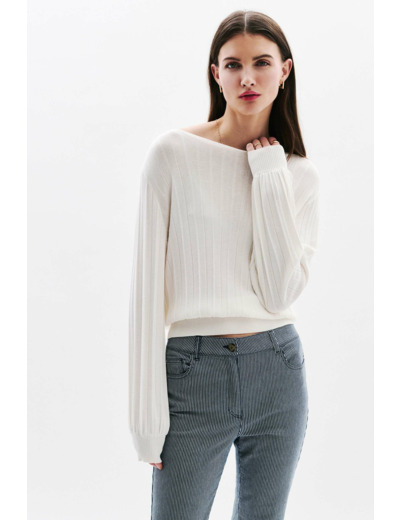 Le pull Mvirginia est fabriqué en viscose Lenzing Ecovero à 89 %, un tissu respectueux de l’environnement, associé à 11 % de polyamide pour une meilleure tenue. Il présente un col bateau, des manches longues bouffantes et une longueur de 57,5 cm pour une taille S.