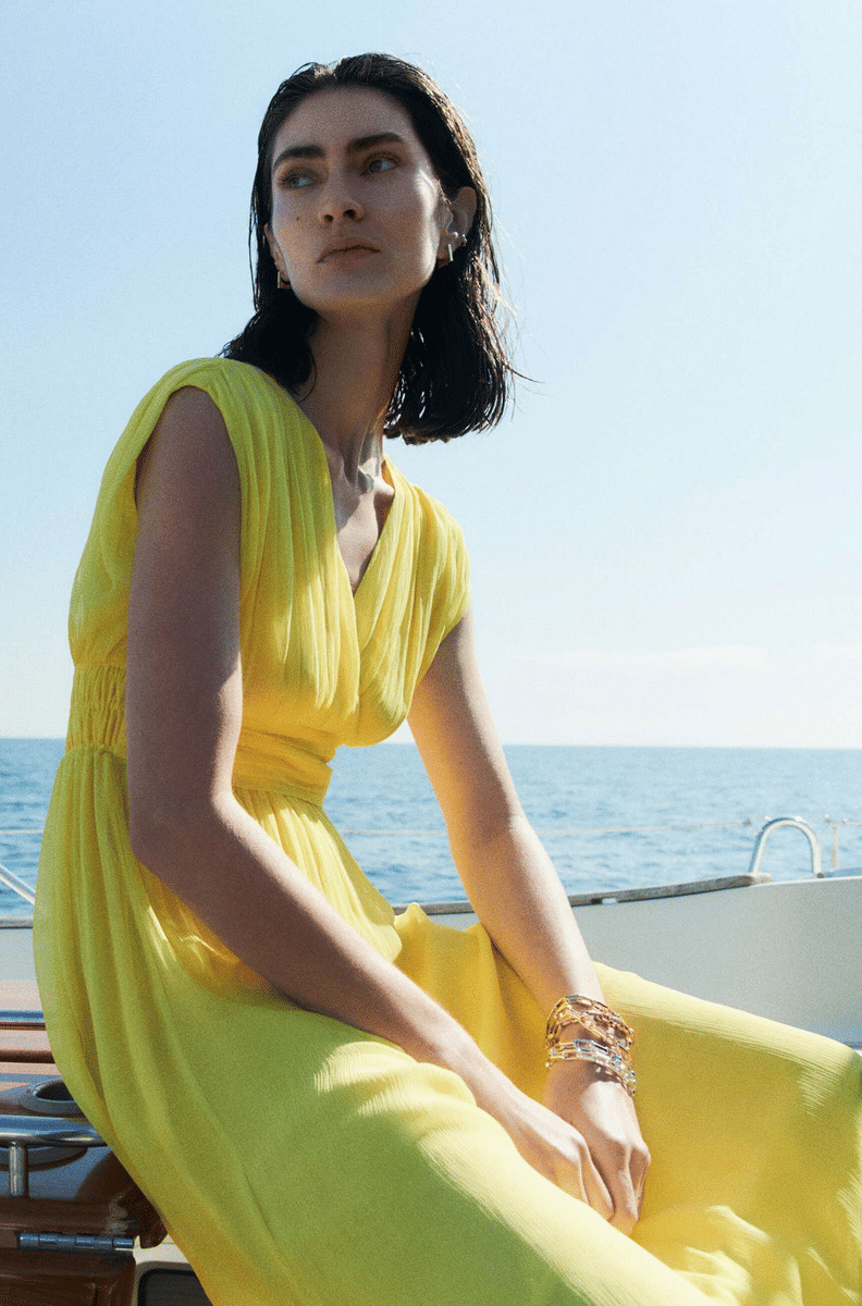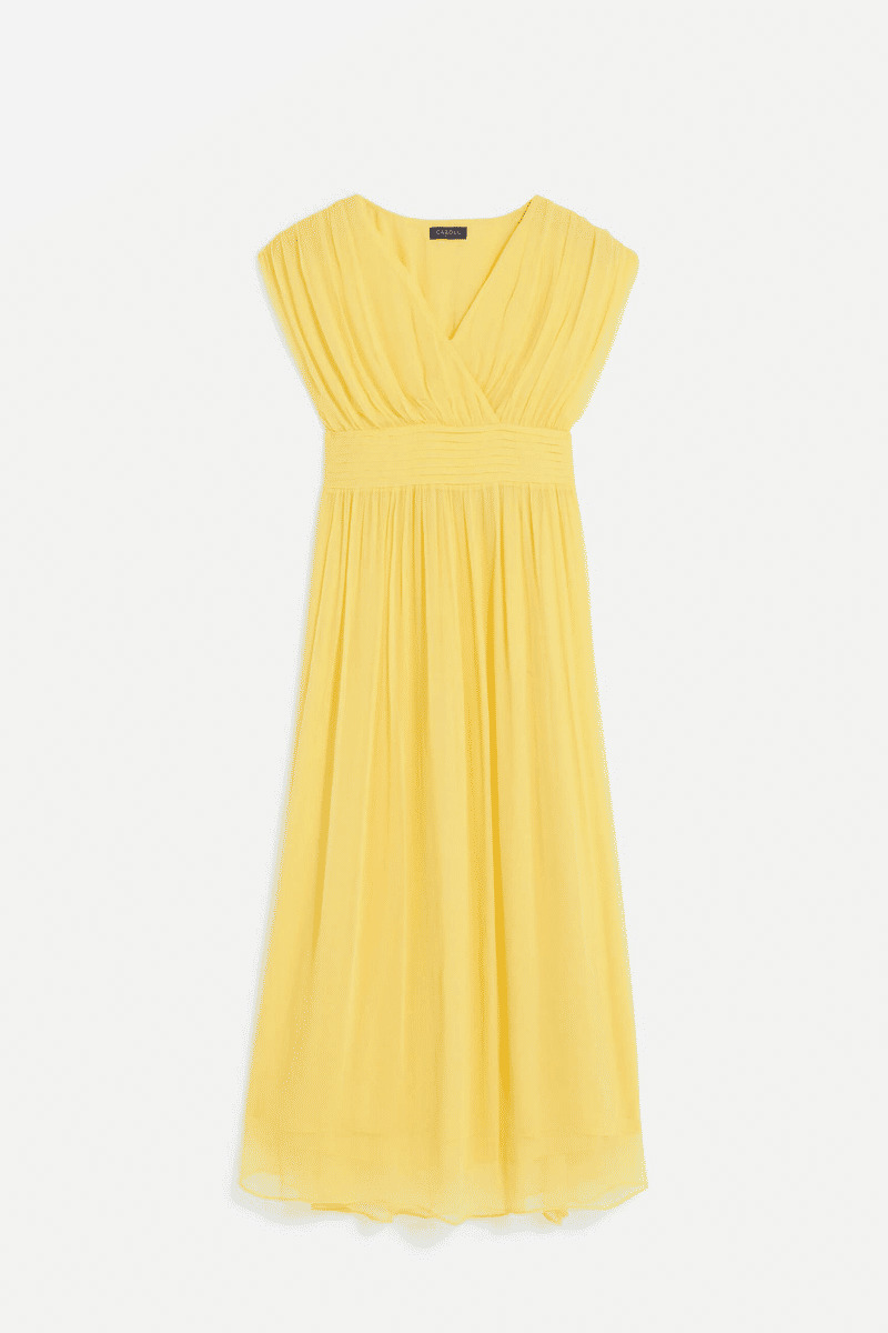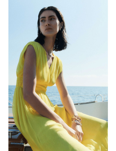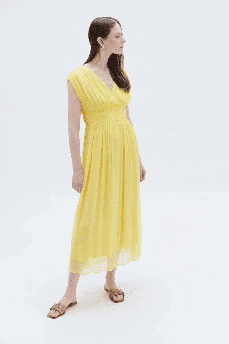 Conçue dans un crêpe de viscose vaporeux, cette robe longue adopte une coupe empire qui flatte toutes les morphologies en soulignant la taille haute. Son décolleté en V façon cache-cœur et ses manches courtes froncées rappellent l’esprit des robes antiques, tandis que le bas évasé apporte un mouvement aérien à chaque pas. Portez-la avec des mules à talon pour une allure sophistiquée ou des sandales en cuir pour un look plus casual.
