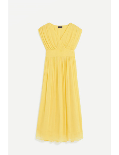 Robe longue à la coupe empire, col V cache-cœur, plis plats sous la poitrine, manches courtes froncées, taille dos smockée, bas évasé et doublure en viscose. Tissu principal 100% viscose, doublure 100% viscose. Lavage à 30°C avec action réduite recommandé.