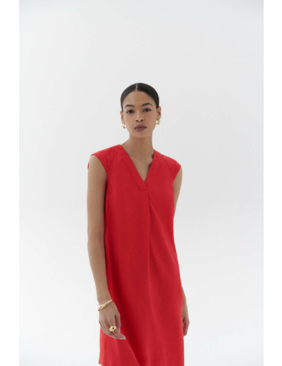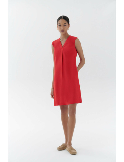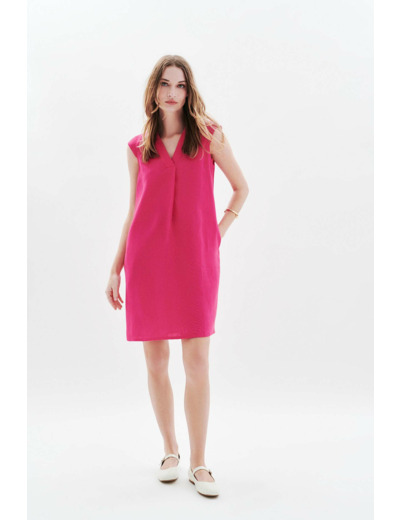Robe à la coupe droite, sans manches avec mancherons, encolure V avec large pli plat. Longueur 95 cm pour une taille 38. Tissu principal : lin 100 %. Modèle non doublé. Lavage conseillé à 30°C avec action réduite pour préserver la matière.