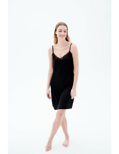 Profitez d’un vêtement qui valorise votre féminité tout en assurant un confort optimal. La finition brillante du tissu principal capte la lumière pour un effet élégant, tandis que la dentelle au col V souligne subtilement votre décolleté. Facile à ajuster, cette robe s’adapte à toutes vos envies.