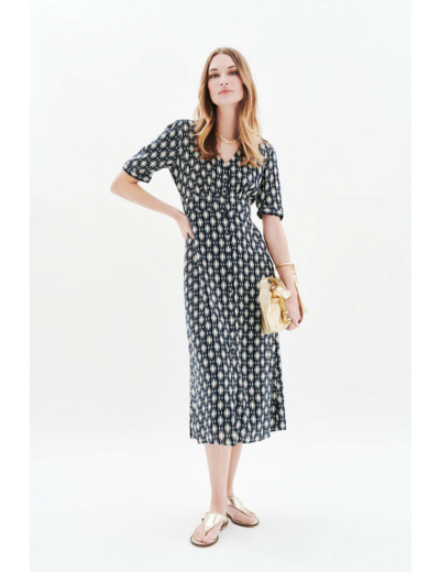 La robe Relina met en valeur le haut du corps tout en floutant délicatement la taille grâce à sa coupe évasée. Son col en V apporte une touche de sophistication tandis que la doublure assure un tombé parfait et un confort optimal. Facile à associer, elle s’adapte aussi bien à des sandales en cuir pour un look décontracté qu’à des bottines fines et une veste courte pour structurer votre silhouette.