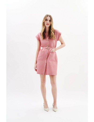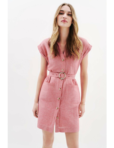 Tissu principal : 58% lin, 42% coton. Doublure : 100% coton. Robe courte à coupe droite, col chemise, manches courtes. Longueur 93 cm en taille 38. Doublée pour un confort optimal. Entretien recommandé : nettoyage à sec professionnel ou lavage à 30°C en cycle délicat, repassage à basse température (maximum 110°), sans vapeur, séchage à l’air libre.