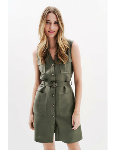 Tissu principal : 55% lin, 45% viscose Ecotang. Doublure : 100% viscose Lenzing Ecovero. Robe courte, coupe droite, col V, sans manches. Longueur 93 cm pour une taille 38. Lavage à 30°C en cycle ultra délicat, repassage à température moyenne (max 150°C). Séchage à l’air libre recommandé, sèche-linge interdit.