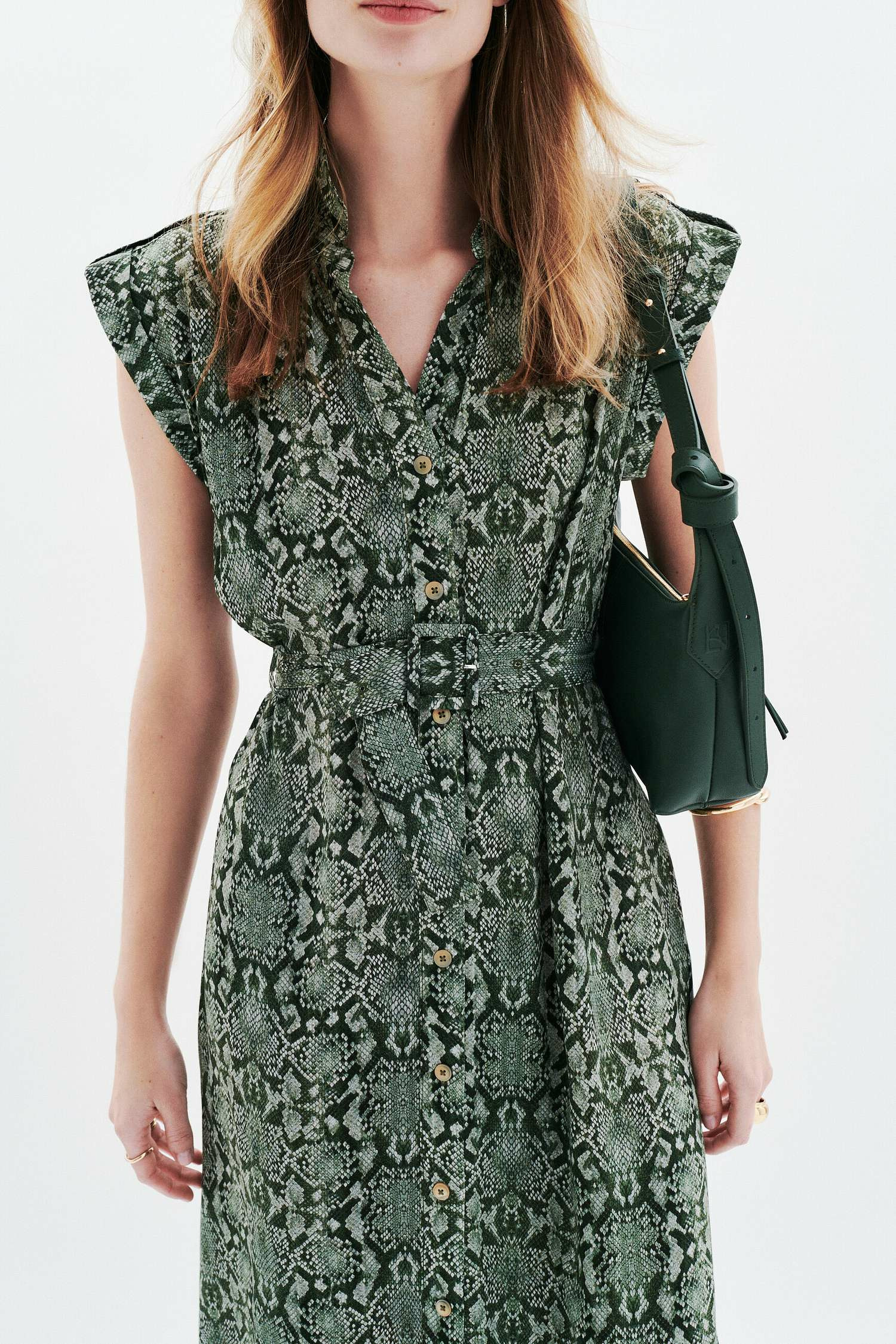 Conçue pour valoriser le haut du corps tout en floutant délicatement la taille, cette robe sans manches se distingue par son col chemise et sa longueur de 125 cm pour une taille 38. Son tissu fluide épouse les mouvements avec légèreté, offrant un confort optimal sans sacrifier le style. Polyvalente, elle se porte aussi bien avec des escarpins crème et un sac vert pour un look sophistiqué, qu’avec des sandales plates et un chapeau large pour une tenue décontractée.