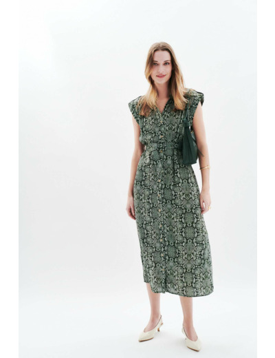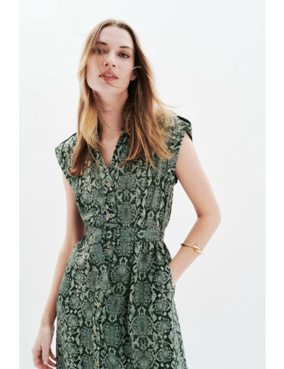 Robe longue coupe droite, sans manches, col chemise, longueur 125 cm (taille 38). Tissu principal composé à 52 % de viscose LENZING ECOVERO et 48 % de viscose. Entretien recommandé : nettoyage à sec professionnel ou lavage délicat à 30°C, repassage à température moyenne (max 150°), sèche-linge interdit.