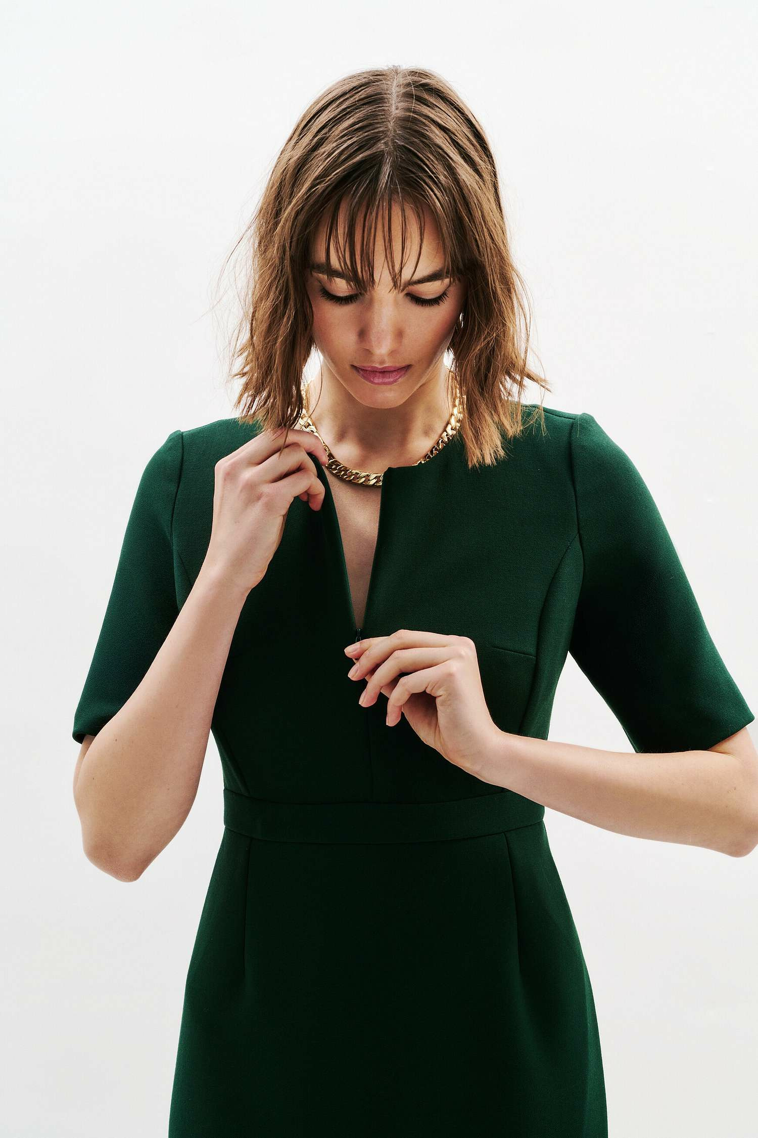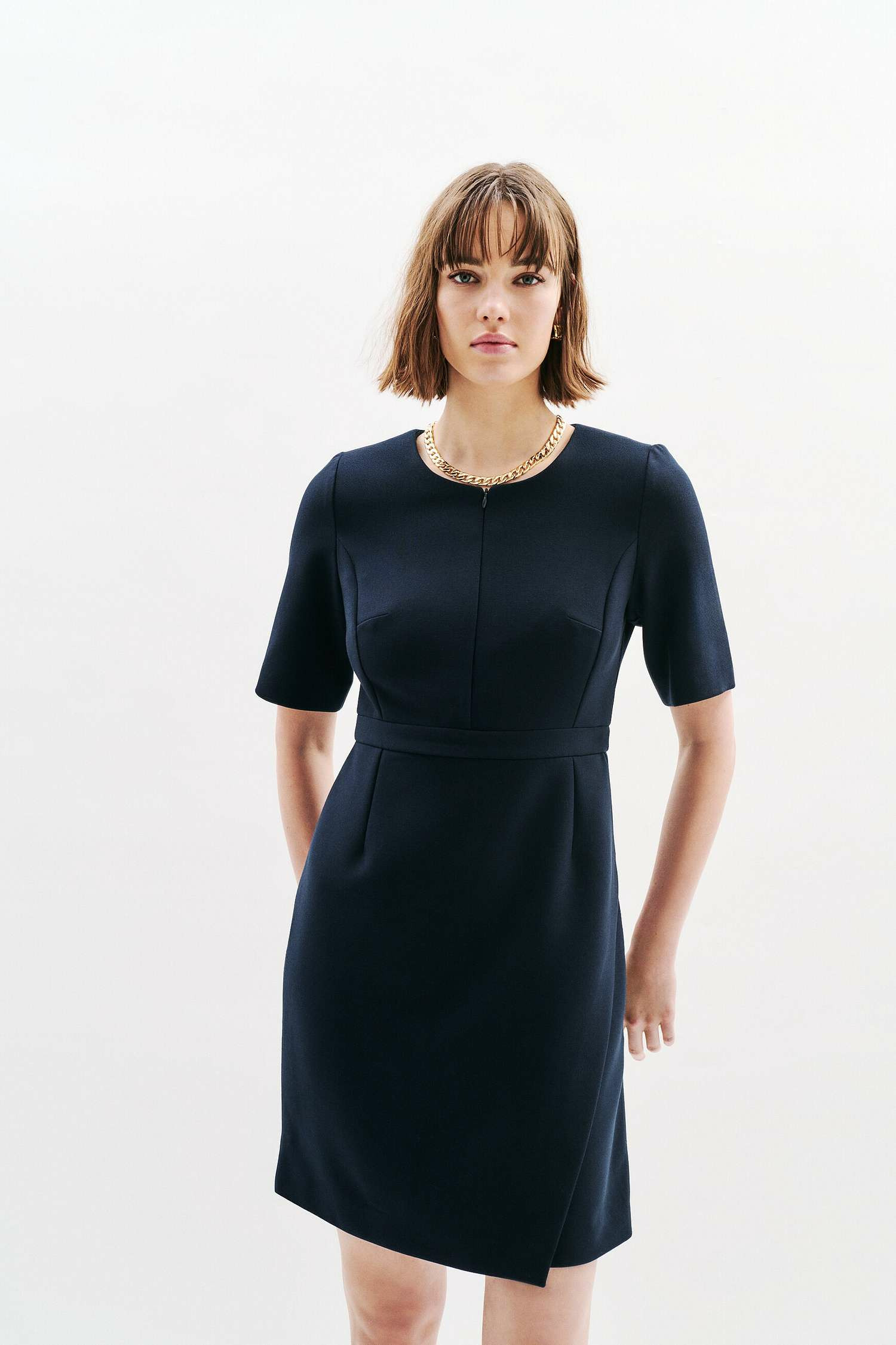 Conçue pour suivre parfaitement les courbes du haut du corps, cette robe à col rond et manches courtes offre un équilibre parfait entre confort et style. Son zip devant et au dos facilite l’enfilage tout en ajoutant une touche contemporaine. Doublée pour un tombé impeccable, elle se porte aussi bien avec des escarpins et une pochette qu’avec un blazer structuré et des bottines à talons, pour varier les looks professionnels.