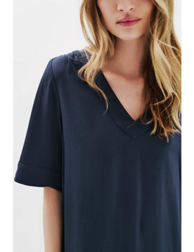 Réponse : La robe est composée à 50 % de polyester recyclé et 50 % de polyester, alliant qualité et respect de l’environnement.