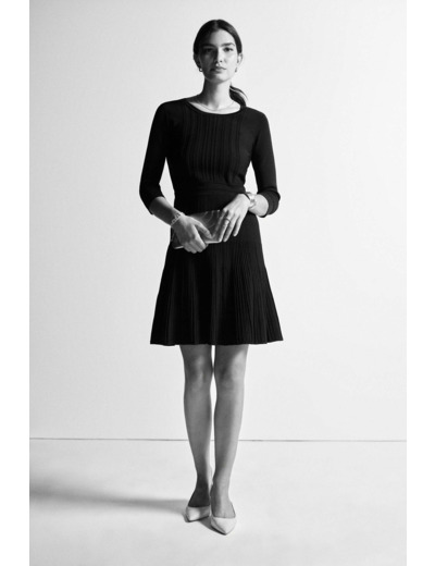 Conçue pour les femmes actives, cette robe courte met en valeur le haut du corps grâce à son col rond et ses manches trois-quarts. Le plissé délicat apporte une touche de sophistication discrète, idéale pour un look working girl raffiné. Sa longueur de 92 cm pour une taille 38 souligne subtilement la féminité sans compromettre la liberté de mouvement.