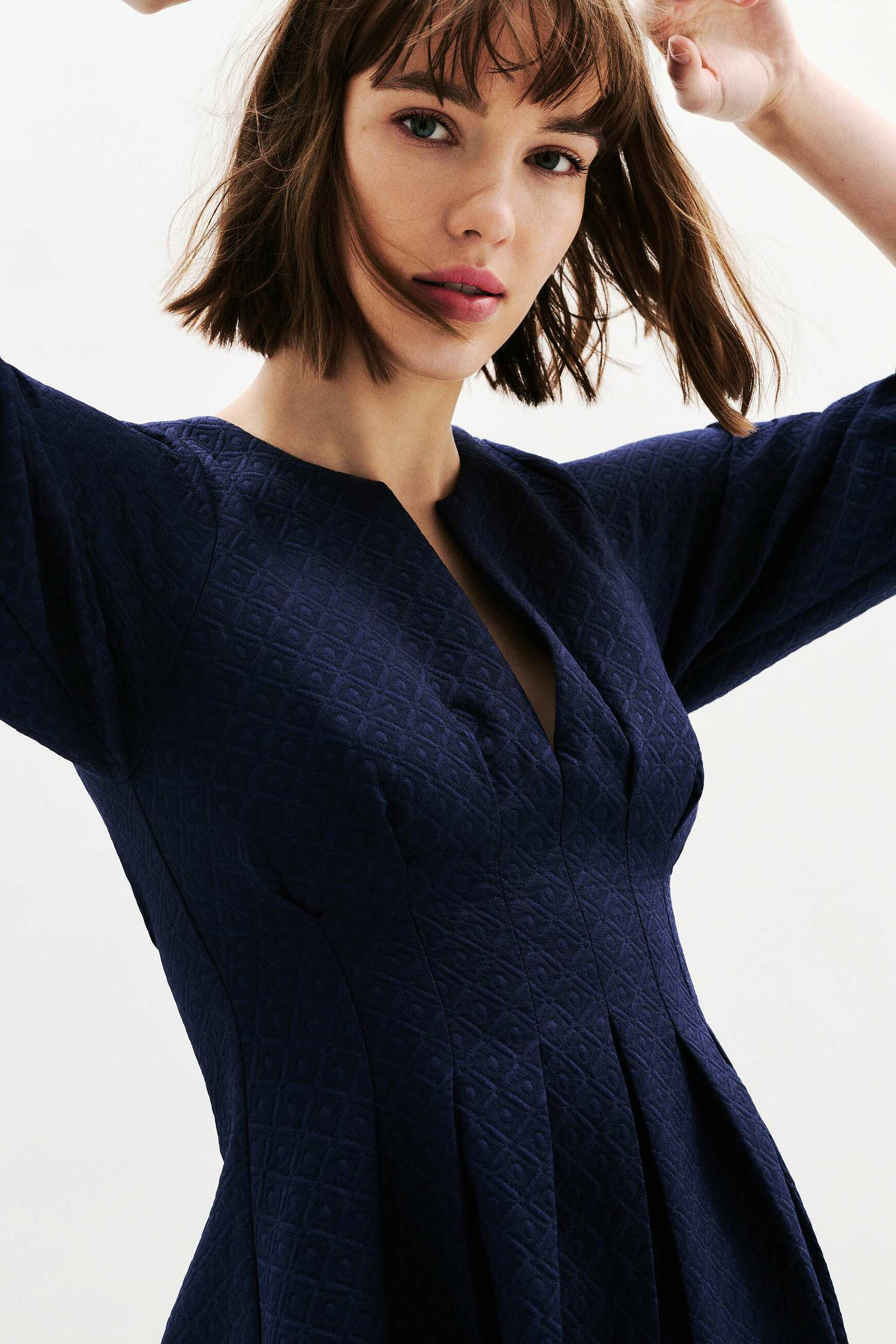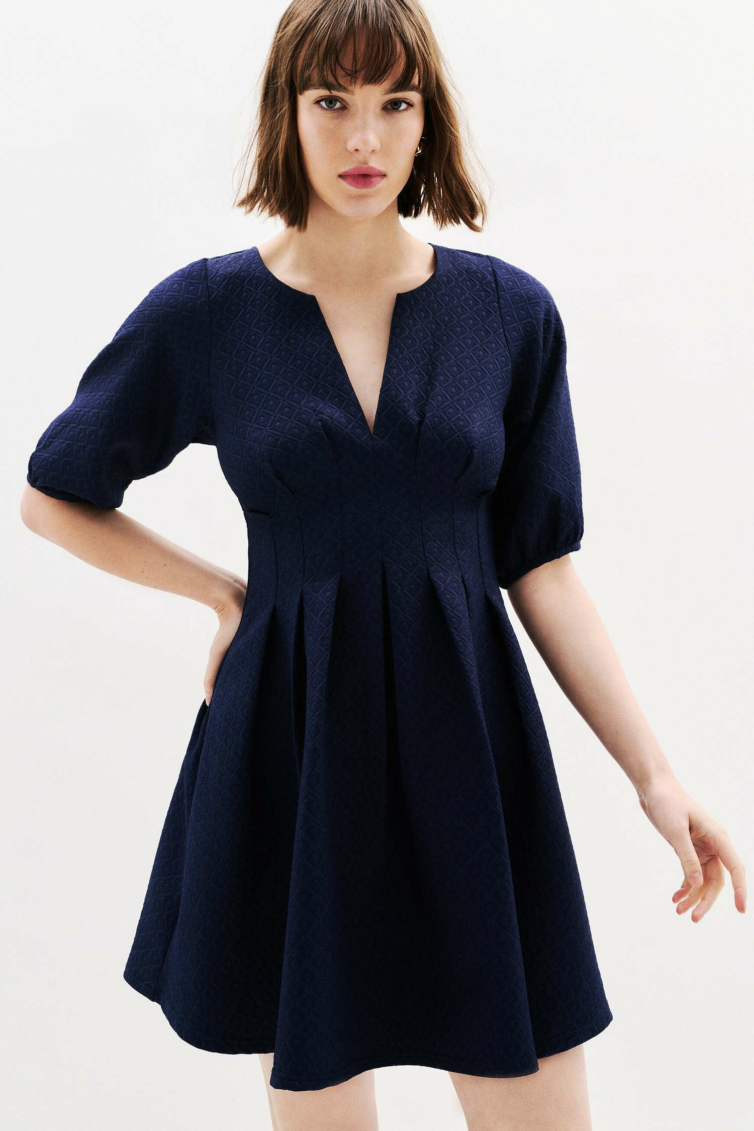 Conçue pour flatter le haut du corps tout en floutant la taille, cette robe courte à col tunisien séduit par ses manches 3/4 bouffantes et sa forme fluide qui accompagne chaque mouvement avec légèreté. Son tissu plissé ajoute une touche de sophistication discrète, parfaite pour une allure chic sans effort.