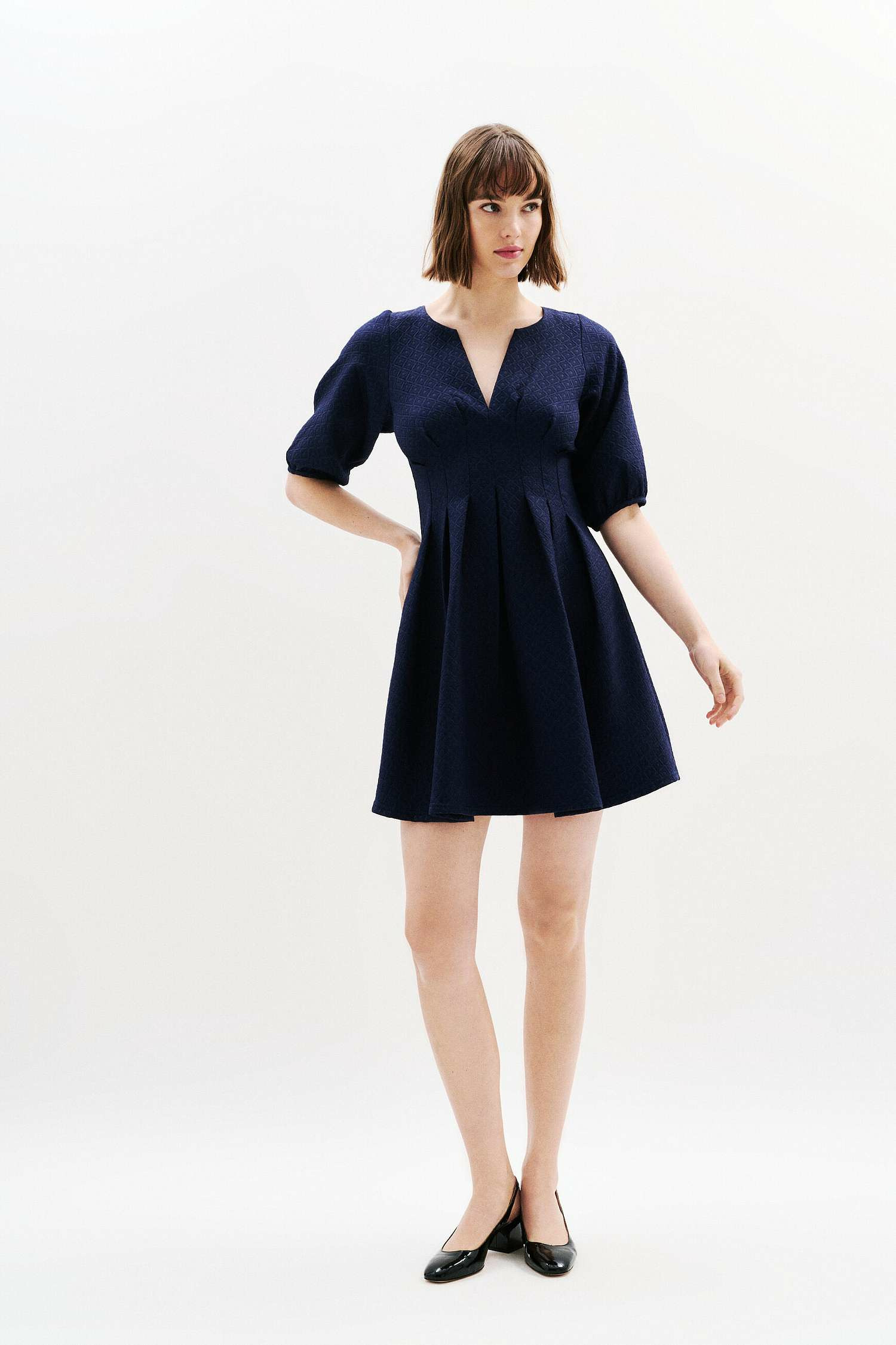 Robe courte, longueur 94 cm (taille 38), coupe évasée, col tunisien, manches 3/4 bouffantes, tissu principal 99% polyester et 1% élasthanne. Nettoyage à sec recommandé, lavage délicat à 30°C possible, repassage à température moyenne (max 150°C), interdit au sèche-linge.