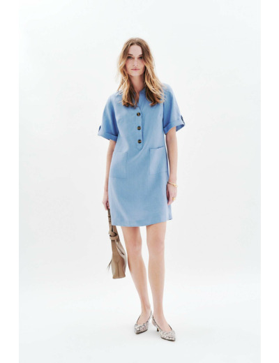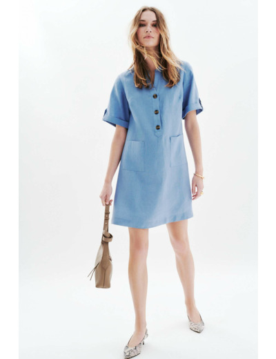 Robe courte en lin 100%, coupe droite, col tunisien, manches courtes. Longueur 94 cm en taille 38. Disponible du 36 au 46. Entretien conseillé : nettoyage à sec recommandé, lavage possible à 30°C en cycle délicat, repassage à basse température sans vapeur, séchage à l’air libre. Ne pas utiliser de sèche-linge.