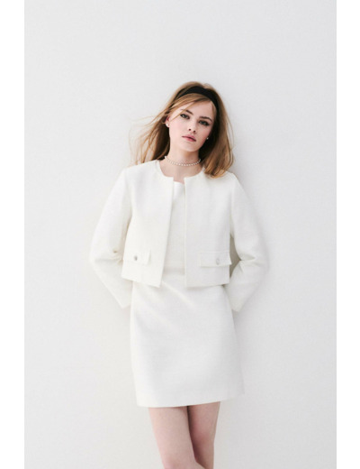 Composition : tissu principal 62 % coton, 30 % polyester recyclé, 8 % viscose. Doublure 100 % viscose Lenzing EcoVero. Longueur 87 cm en taille 38. Lavage délicat à 30°C recommandé, nettoyage à sec conseillé. Repassage à basse température (maximum 110°), sans vapeur. Sèche-linge interdit.
