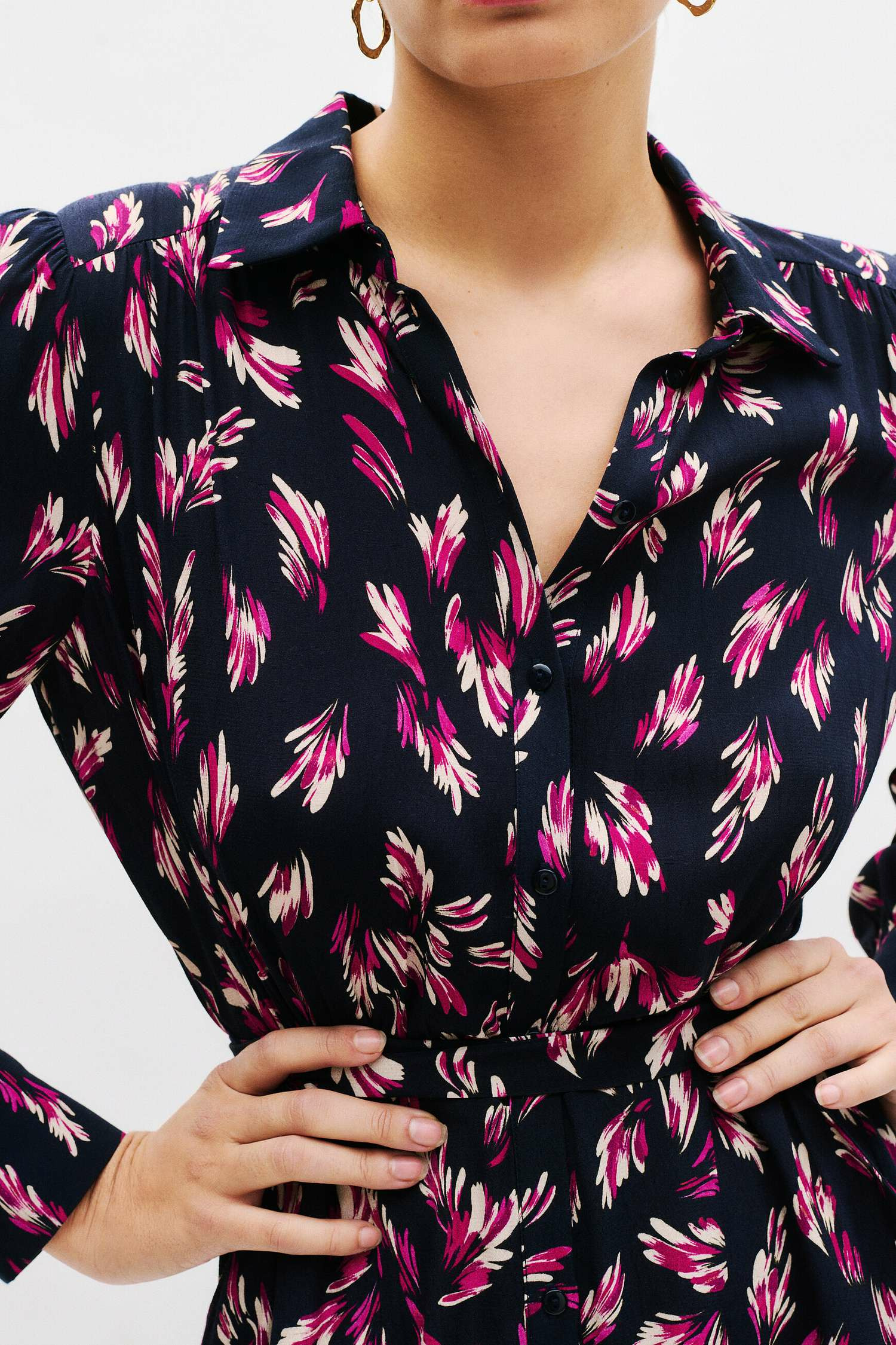 Conçue pour valoriser le haut du corps tout en floutant subtilement la taille, cette robe longueur 3/4 offre un équilibre parfait entre confort et sophistication. Son col chemise et ses manches trois-quarts apportent une touche classique et moderne à la fois, tandis que la doublure en viscose garantit une tenue impeccable et agréable au porter.
