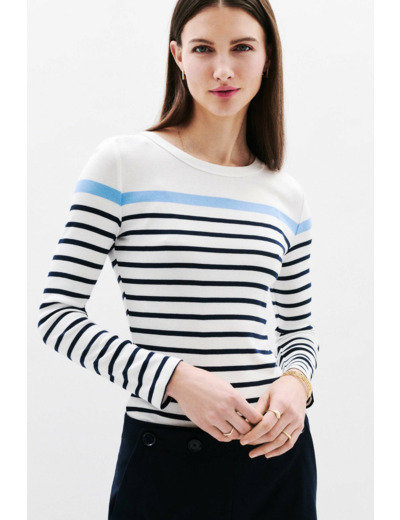 Tissu principal : 50% modal, 50% coton. Lavage recommandé à 30 degrés pour préserver la qualité et la tenue des couleurs. Modèle à manches longues, col rond, coupe droite, rayure rouge contrastée.
