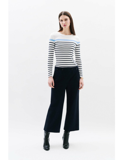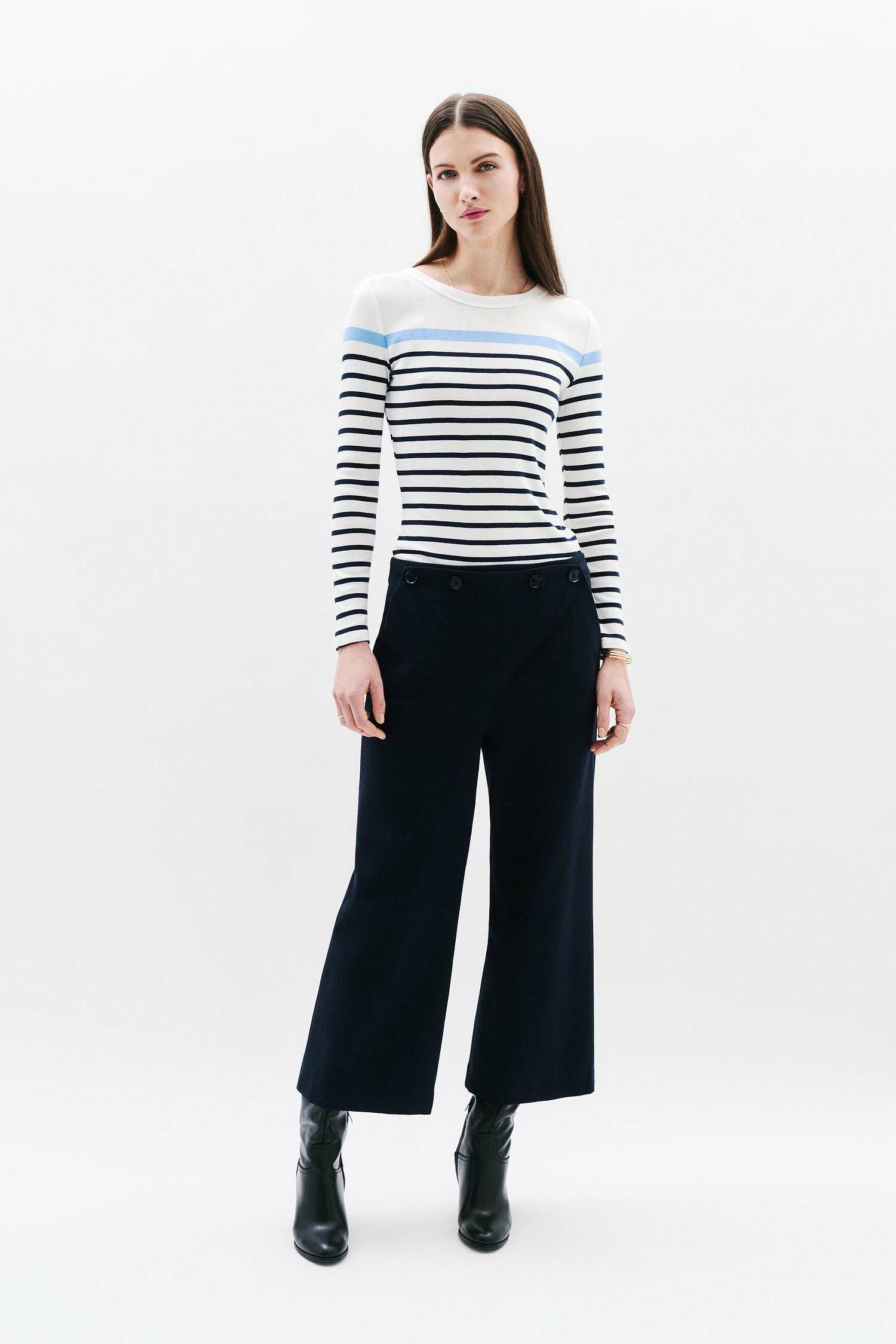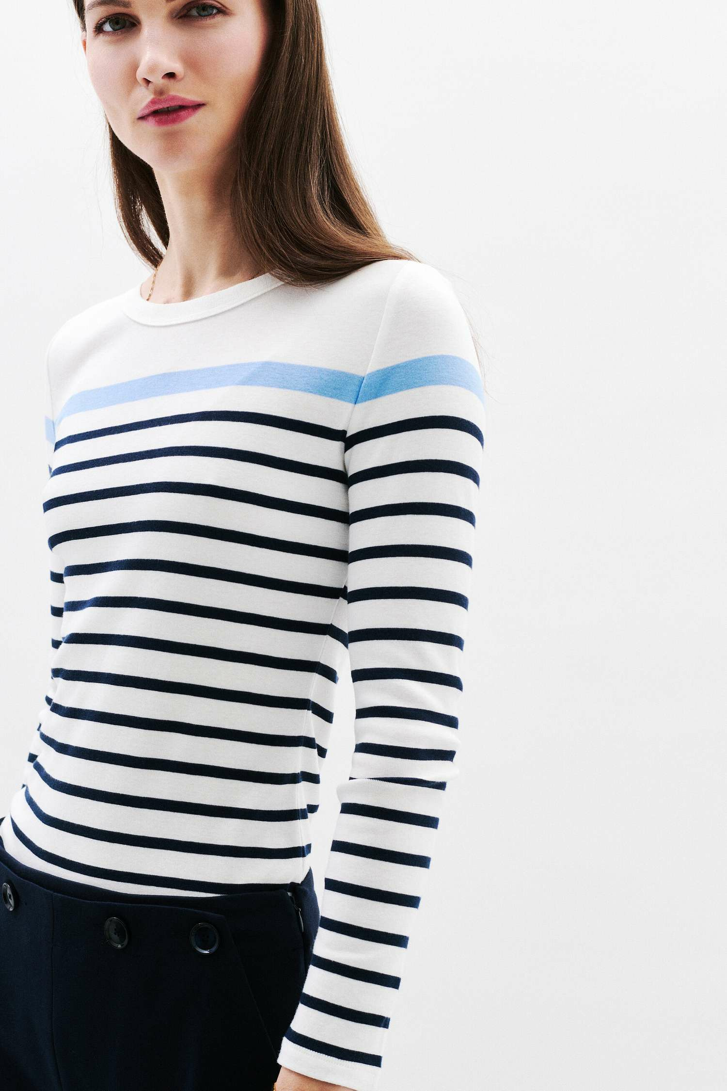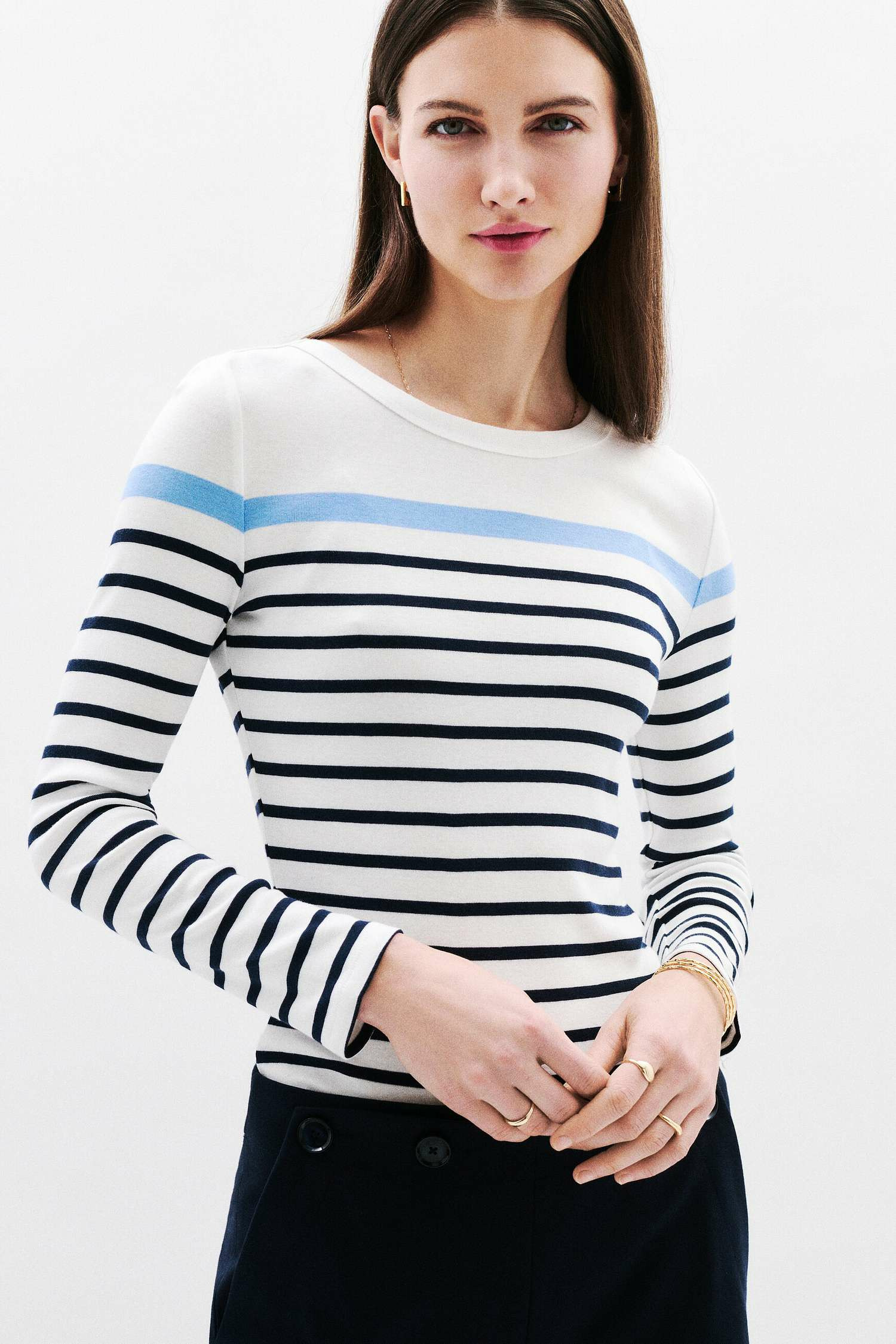 Confectionné dans un jersey de coton modal, ce T-shirt à manches longues allie douceur et légèreté pour un confort optimal tout au long de la journée. Sa coupe droite et son col rond offrent une silhouette épurée, facile à associer avec un jean ou une jupe pour un style décontracté mais soigné. La rayure rouge contrastée fait de ce modèle un incontournable qui se démarque sans effort.