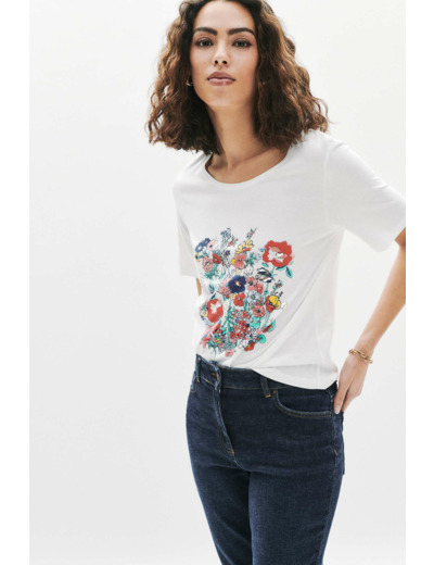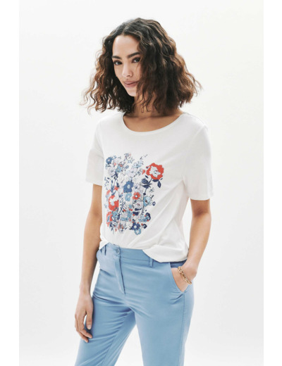 Confectionné dans un mélange doux et respirant de modal et coton, ce t-shirt se porte aussi bien avec un pantalon bleu clair et des ballerines qu’avec une jupe midi évasée et des sandales à talons. Sa longueur de 60 cm en taille S offre un tombé impeccable, idéal pour composer des looks variés du quotidien à la journée.