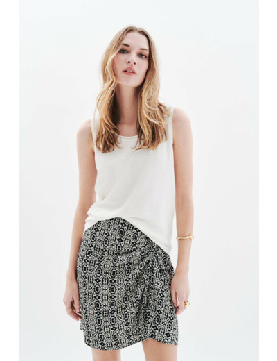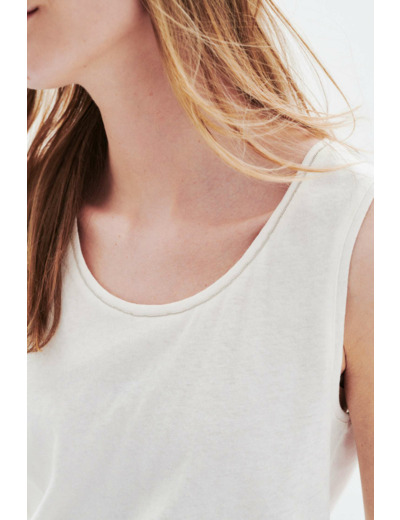 Tissu principal : 70% coton, 30% lin. Longueur 59 cm pour une taille S. Col rond, sans manches. Entretien recommandé : lavage à 30°C, repassage à basse température (maximum 110°) sans vapeur, séchage à l’air libre. Le sèche-linge est à éviter pour préserver la qualité du tissu.