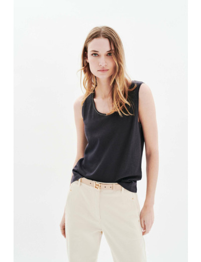 Confectionné en coton et lin, ce t-shirt sans manches offre une sensation douce et aérienne, idéale pour affronter les variations de température. Son col rond classique et sa coupe fluide s’adaptent parfaitement à toutes vos tenues, du look décontracté au style plus travaillé. Portez-le avec un pantalon fluide et des sandales plates pour une allure casual, ou associez-le à une jupe midi imprimée et un cardigan fin pour une silhouette élégante et féminine.