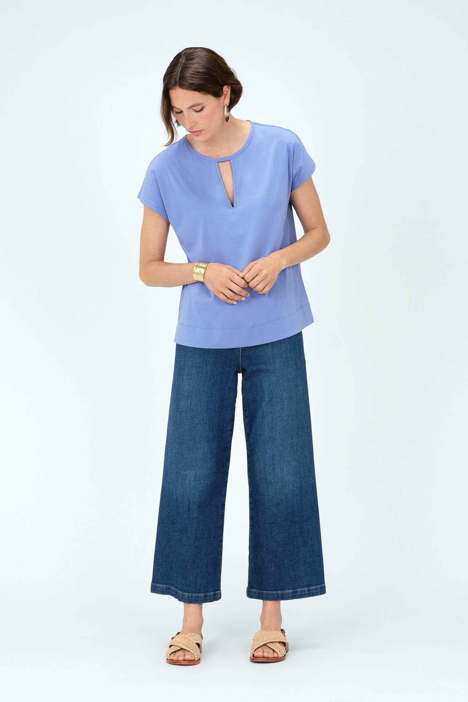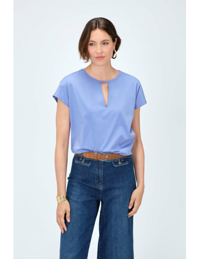 T-shirt col rond à coupe ample, manches courtes, ouverture triangle sous le col. 100 % coton, longueur 62 cm en taille S. Disponible en plusieurs coloris. Lavage recommandé à 30 degrés pour préserver la qualité du tissu.