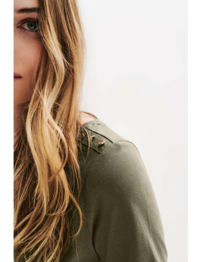Tissu principal : 100% coton biologique. Coupe droite. Col rond. Manches courtes. Longueur 60 cm en taille S. Boutons décoratifs dorés en métal martelé sur l’épaule. Lavage à la main recommandé.