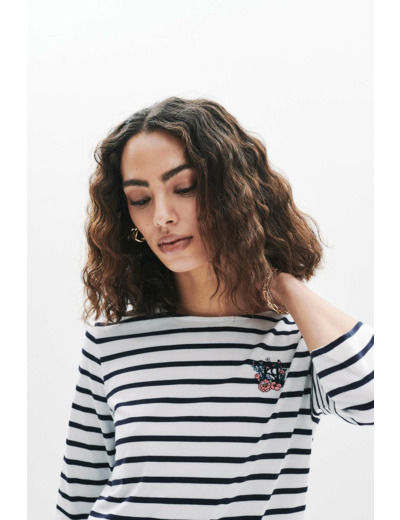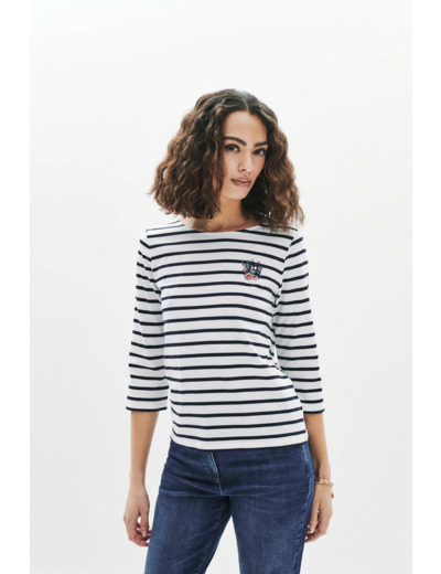T-shirt 100 % coton, coupe droite, col bateau, manches 3/4, longueur 60 cm en taille S. Lavage conseillé à 30 °C, repassage à basse température (maximum 110 °C) sans vapeur. Ne pas utiliser de sèche-linge ni nettoyage à sec.