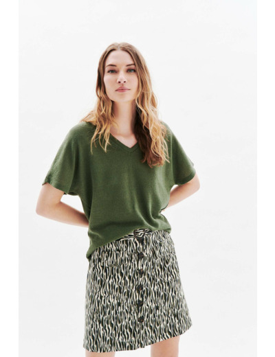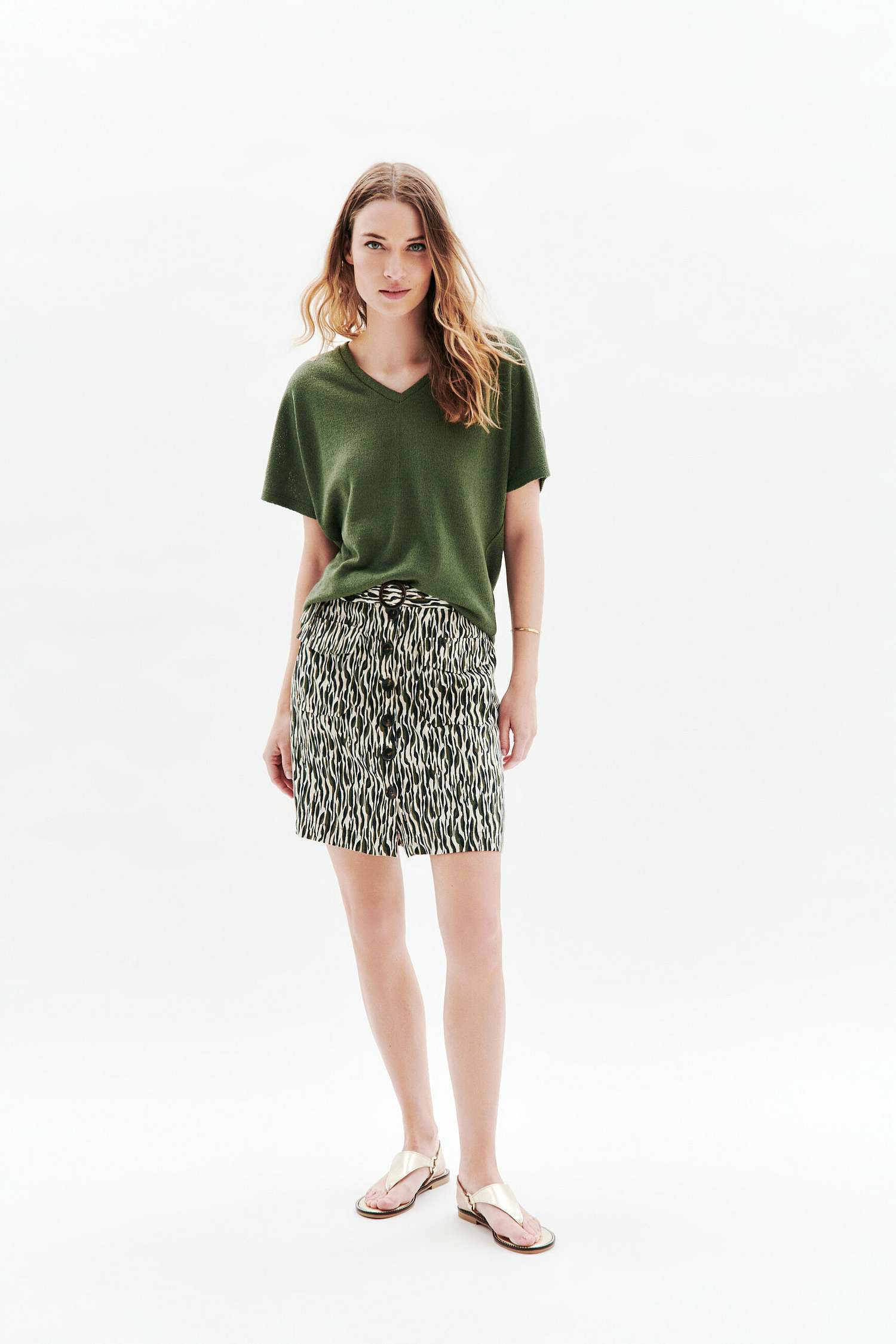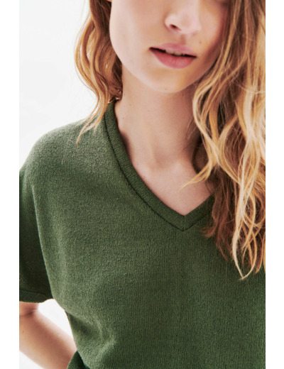 Tissu principal : 60% polyester recyclé, 40% coton. Col en V, manches courtes. Longueur 60 cm en taille S. Lavage en machine à 30°C sur cycle délicat recommandé. Repassage à basse température (maximum 110°), sans vapeur. Ne pas utiliser de sèche-linge ni nettoyage à sec.
