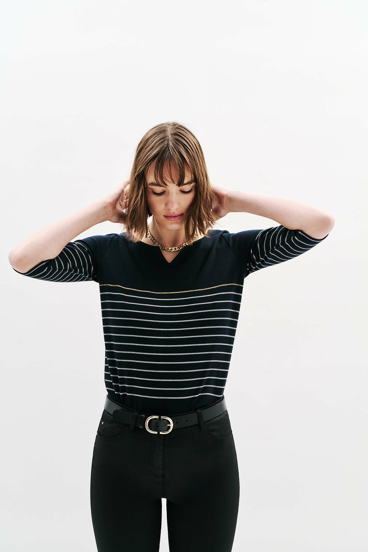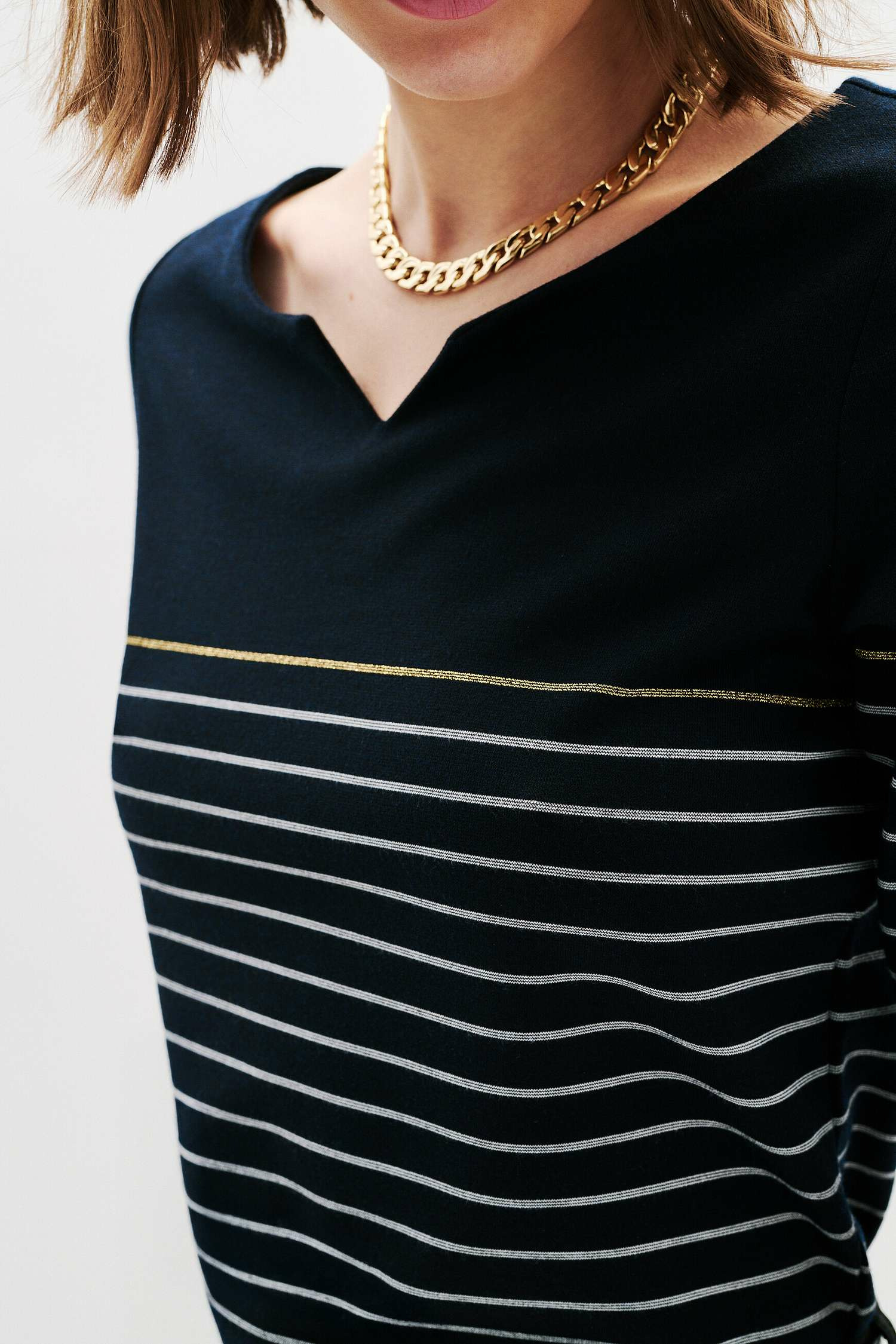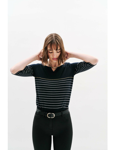 Conçu dans une coupe droite, ce t-shirt marinière joue la carte de la féminité avec ses manches trois quarts et son col tunisien, apportant une touche sophistiquée à un imprimé intemporel. Sa longueur de 60 cm pour une taille S permet de le porter aussi bien glissé dans un pantalon droit qu’avec une jupe crayon ou un jean flare, pour un look moderne et équilibré. La finesse du tissu et le fil métallisé ajoutent une subtile brillance qui dynamise l’ensemble.