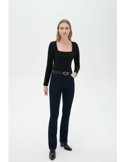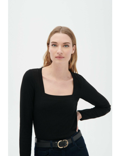 Tissu principal : 46% coton, 46% viscose, 8% élasthanne. Coupe ajustée, manches longues, encolure carrée. Longueur : 60 cm en taille S. Lavage conseillé à 30 degrés pour préserver la qualité du tissu.