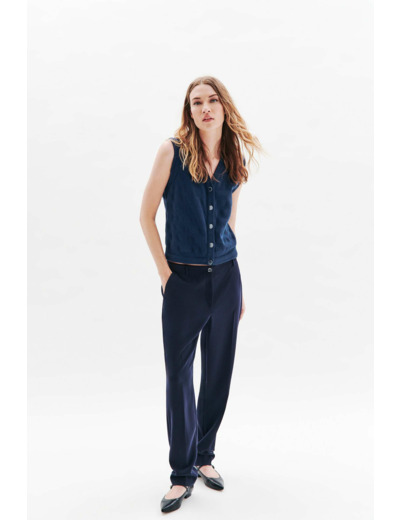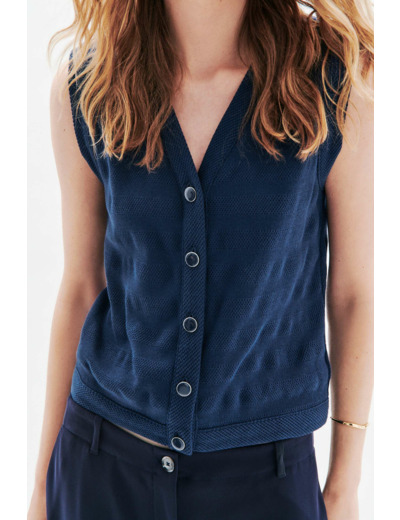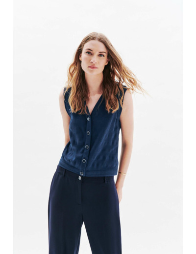 Tissu principal : 100 % coton. Longueur 56 cm pour une taille S. Col en V, sans manches. Lavage à 30°C en cycle délicat recommandé. Repassage à basse température (maximum 110°), sans vapeur. Ne pas utiliser de sèche-linge ni de nettoyage à sec.