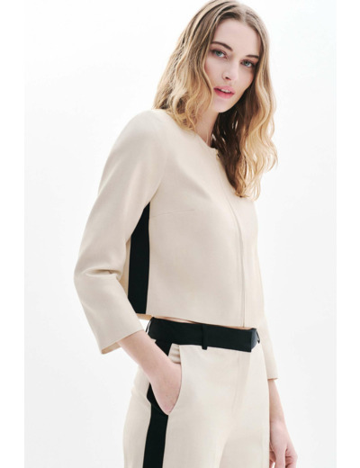 Réponse : La veste Vambras a une coupe droite et cropped qui souligne la taille avec élégance.