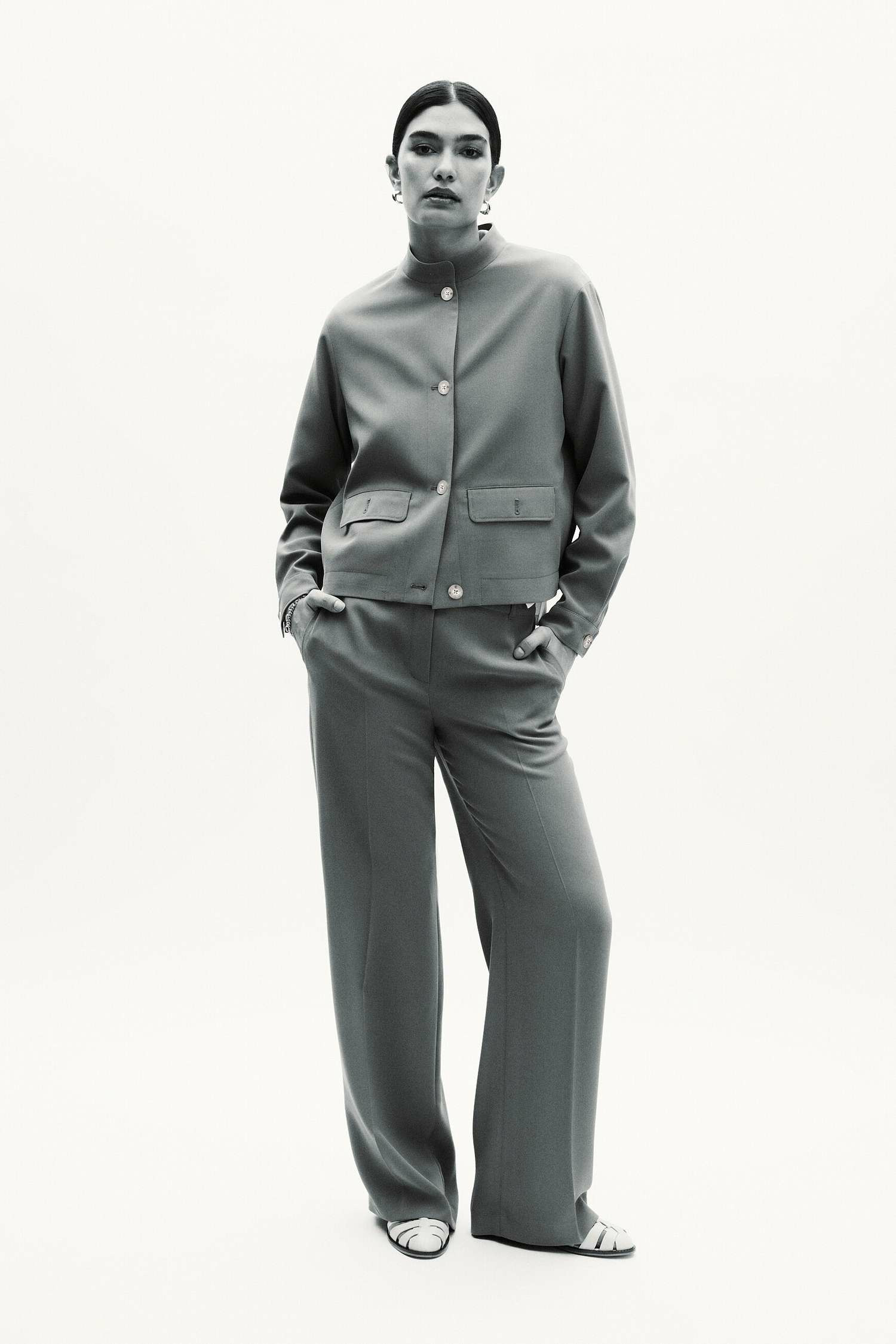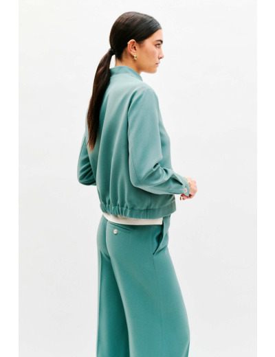Cette veste courte est réalisée dans un tissu principal composé à 60% de polyester et 40% de polyester recyclé, doublée à 100% en viscose, avec une doublure de manche en acetate. Elle se ferme par des boutons discrets et présente un col rond classique. Pour préserver sa qualité, un nettoyage à sec en pressing est recommandé, le lavage en machine ou à la main est interdit, ainsi que le sèche-linge. Le repassage doit être effectué à basse température (maximum 110°) sans vapeur.